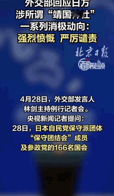 古语有云:前事不忘,后事之师。和平年代最该敬畏历史、坚守良知,可偏偏有人罔顾公理、触碰底线,做出让人无比愤慨的荒唐举动。最近国际大环境整体安稳,大家都在踏踏实实搞发展、守好和平底线,没想到日方又做出让人难以接受的事,公然触碰历史红线,伤害周边各国民众的感情。 4月28日,外交部照常举行例行记者会,发言人林剑现场直面媒体提问,专门针对日方扎堆参拜靖国神社的一系列消极行为作出正面回应,立场坚定、态度严肃,表态力度十足。 记者会现场,总台央视记者直击当下核心热点,针对性提出大家都关心的问题,同一天里,日本政坛大批议员集体出动,动作十分高调。 日本自民党保守派团体“保守团结会”的成员,联合参政党的工作人员,一共166名国会议员和地方议员,组团前往靖国神社完成参拜流程。 全程大张旗鼓公开进行,没有一点收敛的意思,挑衅的意味摆在明面上。 这些人都是在职公职人员,不是普通民间百姓,政坛人员集体做出这种行为,性质比个人私下参拜要严重得多,自然快速引发全网热议。 事情发酵之后,全网都在等中方官方给出明确说法,盼着我方守住历史底线,强硬回击这波不当行径。 面对现场记者的问询,外交部发言人林剑没有丝毫回避,直接亮明中方实打实的态度,每一句话都贴合史实、有理有据,语气严肃又坚定。 官方清晰点明,靖国神社根本不是普通的祭祀场所,实打实是当年日本军国主义发动侵略战争的精神依托,是军国主义的核心标志,里面供奉着二战甲级战犯,放在历史定论面前,就是实打实的战犯神社,没有任何可以辩解、模糊解读的余地。 日方接连推动这类围绕靖国神社的消极动作,看着是一次参拜行为,实则是公然践踏全人类公认的历史正义,无视战争遇难者家属的伤痛,背弃了最基本的人类良知。 二战胜利之后,国际社会一起搭建好了安稳的战后秩序,守住来之不易的胜利成果,这是全人类共同的和平根基。 日方偏偏逆势而为,公然挑战战后国际秩序,无视二战既定历史定论,变相为侵略罪行洗白,为过往的战争恶行翻案,直接破坏周边地区的相处氛围,给整片区域的和平稳定埋下不小的隐患。 依我看,岁月不会抹平历史伤痛,侵略往事铁证如山,谁刻意歪曲历史、祭拜战犯、无视过往苦难,谁就永远得不到受害国人民的谅解,也站不住国际正义的立场。 不管日方后续再有什么同类消极举动,中方都会全程紧盯、坚决反对、严厉回击,绝不会放任不良势头蔓延。 守护真实历史、守住和平初心,从来都不是一个国家的事,所有爱好和平、坚守正义的国家都该并肩发力,铭记历史,才能稳稳守住当下的安稳生活。 信息来源:北京日报