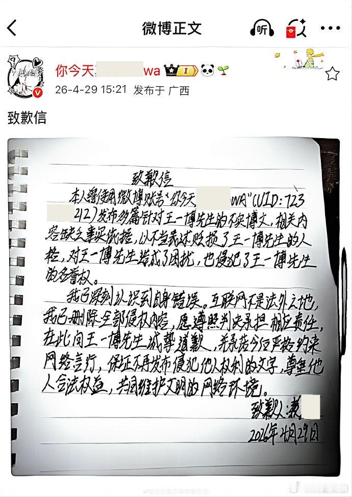 【王一博黑粉发布手写致歉信】王一博方维权案进展 据:2026年4月29日,王一博先生诉赖*(“你今天****wa”,UID:723****212)网络侵权责任纠纷(名誉权)一案,被告赖*遵照生效民事判决书,在涉案微博账号中发布致歉信,向王一博先生公开致歉。