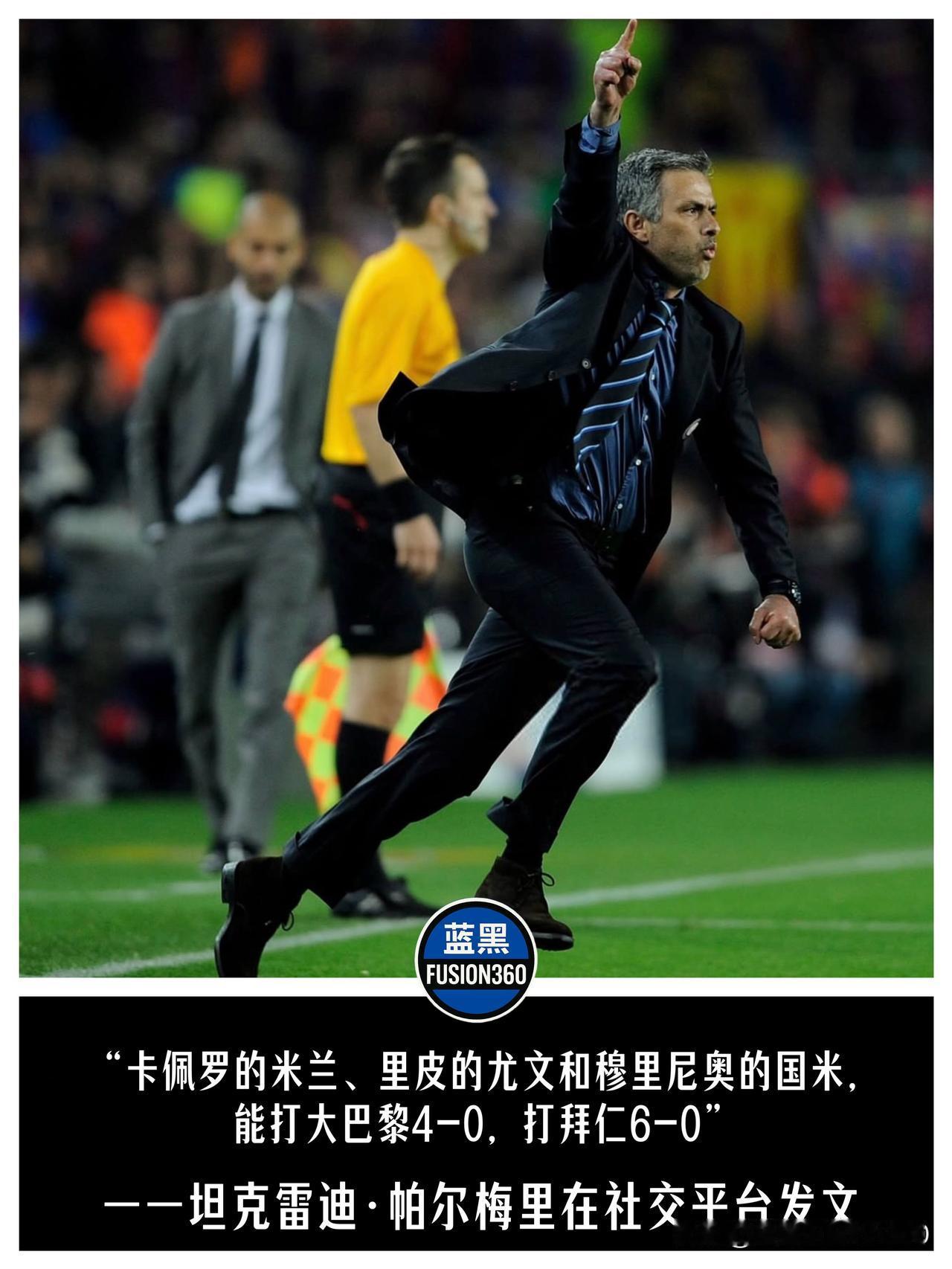 帕尔梅里豪言穆氏国米能打拜仁6-0!跨时代对比引战,但当年极致防反确实专克花拳绣腿 名嘴帕尔梅里在看完欧冠半决赛后,直接在社交平台上放出了极具争议的狠话。他断言卡佩罗的米兰、里皮的尤文以及穆里尼奥的国米,如果放到现在的欧冠赛场,能直接踢大巴黎一个4-0,踢拜仁一个6-0。这种跨时代的言论迅速引发了球迷的激烈讨论。 直接拿具体比分来“关公战秦琼”确实带有夸张和博眼球的成分。我们结合这几支球队的战术特点来拆解,帕尔梅里的话并非完全没有逻辑支撑。 现在的大巴黎和拜仁在进攻端极其依赖球员个人的提速和转换空间,一旦陷入高强度的阵地战,防线往往容易暴露出巨大的开阔地和退防不及时的隐患。 当年穆里尼奥打造的那支国米,最核心的武器就是极致的防守纪律和刀刀见血的快速反击,球队整体退防时的三线距离保持得极其紧凑。如果在场上真刀真枪地硬碰硬,这种严密的低位防守体系正好能掐死如今这些球队华而不实的推进网络。国际米兰 💙🖤