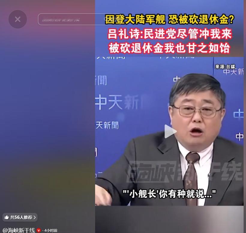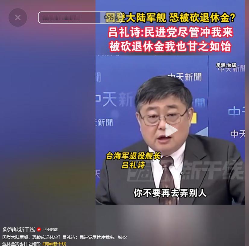 台湾退役舰长登大陆军舰说真话,竟遭致命威胁:敢赞祖国强大,就砍你退休金。面对民进党当局的赤裸裸施压,前海军少校吕礼诗没有半分怂,直接硬气喊话:“民进党尽管冲我来,就算被砍退休金,我也甘之如饴!” 事件的导火索,发生在 2026 年 4 月 23 日。 当天是中国人民解放军海军成立 77 周年纪念日,青岛举办了舰艇开放活动,吕礼诗受邀前往现场,登上了 052D 型导弹驱逐舰乌鲁木齐舰与 054A 型导弹护卫舰潍坊舰参观。 作为一名有着丰富舰艇服役经验的前海军舰长,他并非走马观花式的游览,而是从专业视角对舰艇的建造工艺、装备配置、训练保障进行了细致观察。 在参观过程中,吕礼诗注意到,解放军舰艇的做工极其精细,全舰看不到一丝锈水痕迹,防滑设计的水准甚至优于不少外国军舰。 舰上防火衣、氧气呼吸器等装备摆放整齐规范,训练器材有着清晰的使用磨损痕迹,足以印证部队日常训练的高强度与实战化水准。 面对媒体镜头,他直言不讳地表示,大陆海军的装备与美军已经没有代差,从细节之处就能看出,“解放军海军准备好了,能够为祖国海疆安全做到最大程度的保障”。 更让绿营破防的,是吕礼诗始终秉持的两岸立场。他在受访时反复强调,“两岸是一家人,祖国强大了,就代表台湾更安全”,还在乌鲁木齐舰的留言板上郑重写下了 “两岸一家亲” 五个字。 这番发自肺腑的感言,很快传回台湾岛内,瞬间戳中了民进党当局的敏感神经,一场针对他的政治围剿迅速拉开序幕。 4 月 27 日,民进党 “立法院” 党团干事长庄瑞雄率先发难,公然污蔑吕礼诗 “敌我不分”。 同一天,台防务部门负责人顾立雄公开表态,声称对吕礼诗的言论 “深感不齿”,并透露台陆委会已将 “两岸人民关系条例” 修正草案送至台立法机构,核心内容就是将可扣减、停发退休俸禄的惩戒对象,从原本的 “少将以上” 退役军官,大幅扩大至 “少校以上且领有月退休俸的人员”。 明眼人都能看出,这项被岛内舆论称为 “吕礼诗条款” 的修法,就是专门为了针对此次事件中的吕礼诗量身定做。 随后,台陆委会也跟进发声,声称要研究吕礼诗的行为是否 “违法”,扬言要通过修法填补所谓 “灰色区域” 的漏洞;台行政机构负责人卓荣泰更是加入指责行列,斥责吕礼诗的言论违背了军人的忠诚义务,要求尽快推动修法完成惩戒。 从立法部门到行政机构,民进党当局上下联动,只为用退休金这根 “软肋”,惩罚一位说了实话的退役军官。 面对排山倒海般的政治压力和赤裸裸的威胁,吕礼诗没有丝毫退缩,反而用一句句掷地有声的回应,展现了中国军人的铮铮铁骨。 返台当天,他就在社交媒体上发文报平安,明确表态无论民进党施加的压力有多大,自己依然坚持在乌鲁木齐舰上所说的每一句话,坚守 “大陆越强大,台湾越安全” 的信念,直言 “威武不能屈”。 在后续的媒体节目中,吕礼诗更是直面民进党当局的威胁,霸气发声:“如果要针对我,民进党尽管冲我来,就算真的被砍掉退休金,我也甘之如饴。” 他同时恳切呼吁,所有的压力和后果都由自己一人承担,不要因为这件事牵连其他无辜的退役同袍。这份坦荡与担当,让无数两岸网友为之动容。 事实上,这早已不是吕礼诗第一次因为直言祖国强大而遭到绿营攻击。 2024 年珠海航展,他成为登上运 - 20 的台湾第一人,一句 “想让台湾民众知道我们中国有多强” 就让绿营集体破防;2025 年九三阅兵,他又以台湾海军退役军官的身份参与观礼,再次遭到民进党方面的言语围攻。 彼时,因为他退役时的军衔是少校,不符合当时条例中 “少将以上” 的惩戒范围,民进党当局的惩处企图没能得逞,如今便不惜专门推动修法,也要对他进行政治清算。 吕礼诗曾说,“我是中国人,这是刻在 DNA 里的,不会因为民进党的政治操弄而改变”。 他始终坚信,两岸同属一个中国,兄弟不能阋墙,只有回到 “九二共识” 的共同政治基础上,才能共创中华民族的伟大复兴。 而他口中 “祖国强大,台湾才会更安全” 的朴素道理,恰恰是民进党当局最不愿让台湾民众听到的真相。 民进党当局口口声声标榜 “民主自由”“言论自由”,却在一位退役军官说出自己的真实见闻后,立刻撕下伪装,动用行政和立法资源进行全方位打压,甚至不惜修改法律,妄图用剥夺养老保障的方式钳制言论。 这种闻 “统” 色变、动辄搞政治清算的行为,不仅彻底戳破了其所谓 “民主” 的虚伪面具,更暴露了其面对祖国发展壮大时,深入骨髓的恐惧与不自信。 如今,岛内越来越多的有识之士站出来声援吕礼诗,广大网友也纷纷为他的风骨点赞。 两岸同胞同根同源、血脉相连,正常的交流往来是民心所向,民进党当局用政治操弄筑起的高墙,终究挡不住历史前进的洪流,更改变不了祖国必然统一的大势。