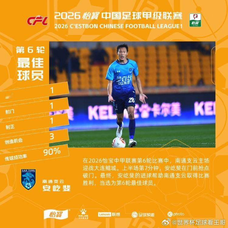 在该轮南通支云主场1-0击败大连鲲城的比赛中,安屹斐在比赛第7分钟破门,帮助球队击败对手,并被评选为第6轮最佳球员。