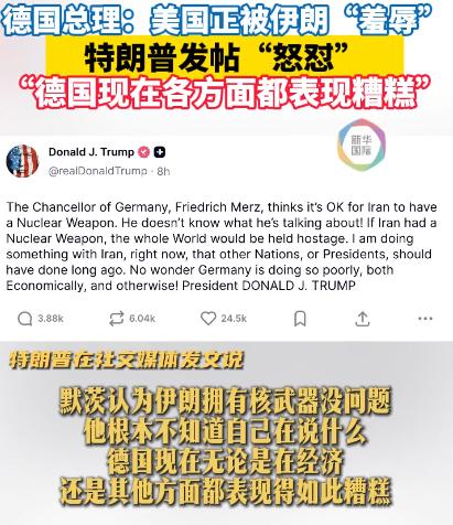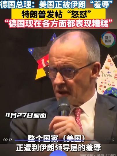 特朗普又瞎较真了。 2026年4月下旬,德国总理公开直言,美国在和伊朗的博弈中被狠狠羞辱。这话直接惹毛特朗普,第二天,他直接在社交平台发帖怒怼,隔空打起了口水仗。 事情的来龙去脉得从4月27日说起,德国总理默茨那天在北莱茵 - 威斯特法伦州马斯贝格的一所中学和学生交流,谈到中东局势时,他没绕任何外交圈子,直言不讳地说美国整个国家正被伊朗领导层羞辱。 他这话可不是随口乱喷,是真有实打实的观察。默茨当时就说,伊朗人太会拿捏谈判的分寸了,说白了就是擅长“表面谈、实际不谈”,让美国人跑到伊斯兰堡去谈,最后啥结果没有,灰溜溜地回来。 反观美国,压根就没制定好任何靠谱的战略,就贸然跟伊朗动了手,现在好了,打也打不赢,退也退不得,纯属骑虎难下。 可能有人会问,德国不是美国的铁杆盟友吗?怎么敢这么直白地说美国?其实不光默茨这么想,整个欧洲现在都憋着一股劲儿,早就不想跟在美国屁股后面瞎掺和了。 自从2月28号美国和以色列联手打伊朗以来,欧洲各国就开始陆续“拆台”:奥地利直接不让美国用自己的领空,意大利不准美军用西西里岛的军事基地,西班牙更干脆,连涉美以打击伊朗的飞机,都不让飞越自己的领空。 说白了,欧洲也有自己的小算盘。中东那边一乱,全球能源价格就涨,欧洲的经济本来就不景气,这么一折腾,老百姓的日子更不好过了。所以默茨敢说这话,背后其实是整个欧洲的态度在撑腰。 再说特朗普,他那暴脾气哪能忍得了这个?默茨27号说完,他28号就急了,在自己常用的“真实社交”平台上,直接发帖怒怼,语气冲得不行。 他压根没好好理解默茨的话,反而歪曲人家的意思,说默茨觉得伊朗拥有核武器也没问题,还骂默茨“根本不知道自己在说什么”。 骂完还不够,特朗普还借机踩了德国一脚,说德国现在不管是经济还是其他方面,都搞得一塌糊涂,言外之意就是,你默茨连自己国家的事都管不好,还敢来对美国的事指手画脚? 其实特朗普这么激动,不光是因为被盟友“打脸”,更主要的是他自己的日子也不好过。 4月21号的时候,美联社和美国全国民意研究中心出了个民调,显示他的支持率已经跌到33%了,比3月份又降了5个百分点。 而美伊冲突打得这么窝囊,正是导致他支持率下滑的重要原因之一,默茨这时候出来说这话,简直就是雪上加霜。 而且特朗普现在还面临一个难题,美国国会有个《战争权力法》,规定总统没经过国会授权,对外发动军事行动不能超过60天。 从3月2号他通知国会对伊朗动武算起,5月1号之前就得拿到国会授权,不然就不能再继续打下去。国会那边已经开始给他施压了,他本来就焦头烂额,默茨这一“补刀”,他能不炸毛吗? 再说回美伊博弈本身,现在的局势早就陷入僵局了。 4月22号,美伊之前签的14天临时停火协议到期,特朗普说要无限期延长停火,但双方在第二轮谈判的事上,一直磨磨蹭蹭,谁都不愿意先让步。与此同时,两边在霍尔木兹海峡的对峙,还在一个劲儿地加码。 美国倒是派了三艘航母去中东,摆足了架势,还说自己完全控制了霍尔木兹海峡,甚至下令,只要伊朗在海峡里布雷,就直接击沉伊朗的船。 可伊朗也没怂,不光扣押了两艘违规通过海峡的集装箱船,还宣布要对过往船只收通行费,放话说没有最高领袖的命令,一升石油都别想从海峡运出去。 更有意思的是,4月25号的时候,特朗普本来派了自己的女婿库什纳,还有中东问题特使,准备飞18小时去伊斯兰堡谈事,结果临了又取消了,理由是“不想为无意义的谈话浪费时间”。 而伊朗外长阿拉格齐,也在同一天结束了伊斯兰堡的访问,空手而归,说白了,第二轮面对面谈判其实已经黄了。 现在再看这场隔空口水仗,其实早就不只是特朗普和默茨两个人的争执了,背后藏着的,是美欧之间越来越深的裂痕。 而特朗普再怎么怒怼,也改变不了现实——美国在伊朗面前,确实没占到便宜,反而陷入了“打不得、退不得”的困境;而欧洲,也不再是那个对美国言听计从的盟友了。 默茨说的那些话,不过是把欧洲各国的心里话,摆到了台面上而已。