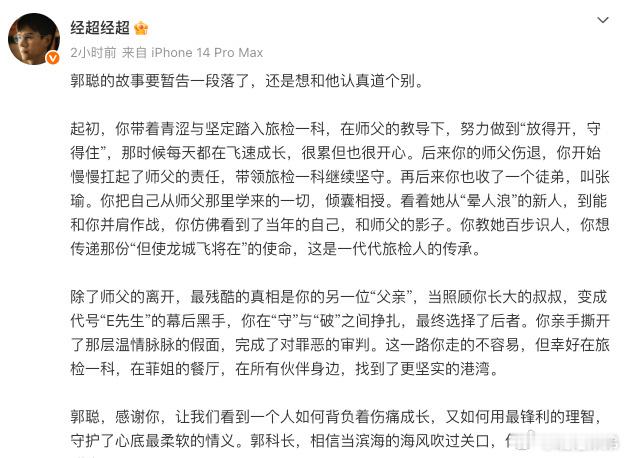 经超发长文告别郭聪经超长文告别郭聪追完剧真的舍不得郭聪这个角色,经超这篇长文看得出来是真的用心投入了。把角色的挣扎、成长和坚守都演活了,现在好好和郭聪说再见,也期待经超之后能带来更多让人眼前一亮的角色。