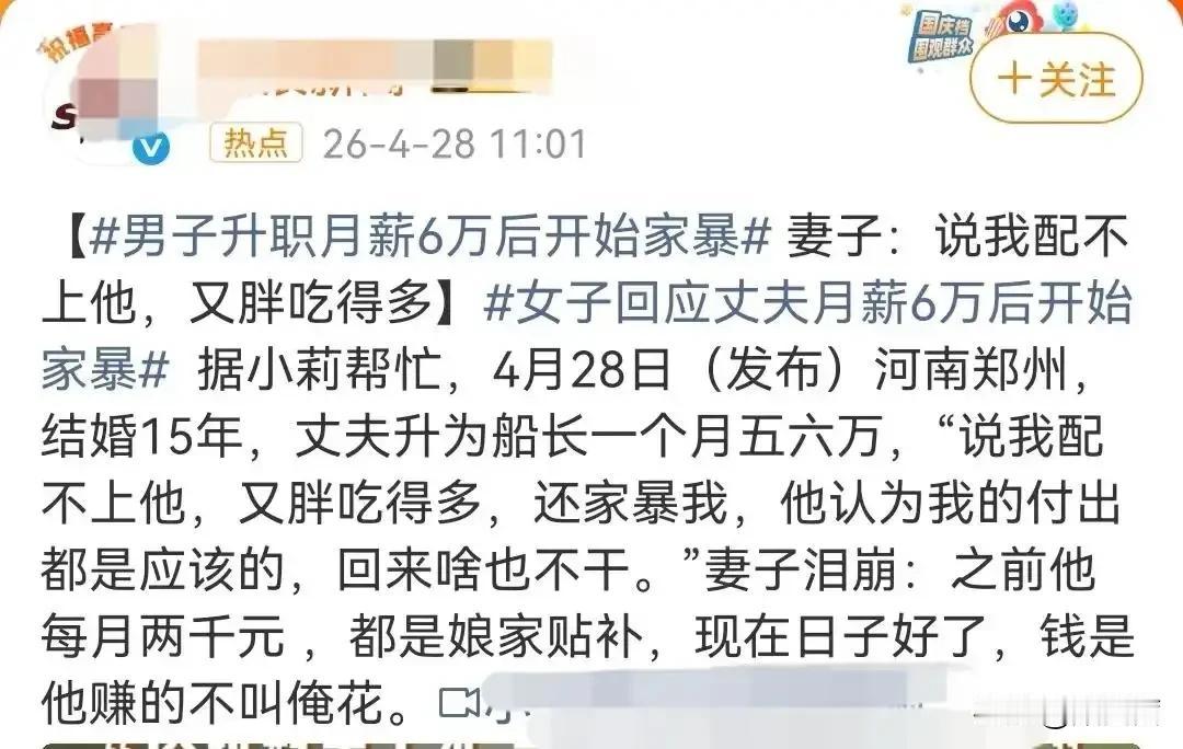 太寒心!郑州男子月薪6万后变脸,15年发妻遭暴打,岳母下跪都拦不住 能共苦却不能同甘,这句话在郑州这对夫妻身上体现得淋漓尽致!邓女士和丈夫结婚15年,当初丈夫月薪仅2000多,全靠娘家接济,日子虽穷却和睦。 三年前丈夫升职船长,月薪暴涨到6万后,一切都变了。他开始嫌弃陪自己吃苦的邓女士,觉得她配不上自己,不仅不给家里一分钱,还频繁家暴。邓女士说,丈夫一年在家5个半月,有4个月都在打她。 前不久一次争吵,丈夫直接揪住她头发疯狂扇耳光、捶打头部,年迈的岳母吓得当场下跪求情,他却依旧不肯停手,连上前护母的女儿都被威胁。经诊断,邓女士头部伤势凶险,只差3厘米就危及生命。 如今邓女士忍无可忍,保留证据报警并求助媒体。可丈夫仍矢口否认家暴,还强行带走两个儿子不让她探视。目前警方已立案调查,妇联也介入提供法律援助,不少网友都在等官方严惩结果,为邓女士讨回公道。