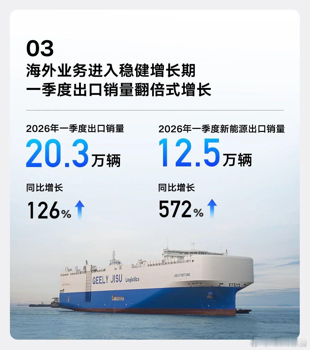 出口表现强势,出口20.3万辆同比涨126%,新能源出口12.5万辆,暴涨572%。公司手握602亿元现金,将深耕新能源、智能化赛道,加速全球化布局。吉利汽车发布一季度财报吉利汽场全开新能源汽车