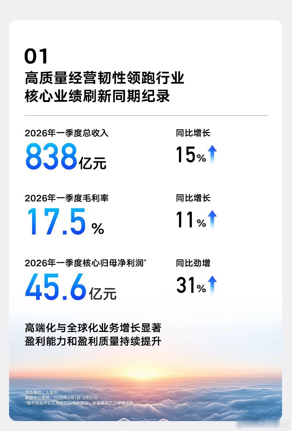4月29日,吉利发布2026年Q1财报,一季度营收838亿元,同比增15%,首破800亿创同期新高;核心归母净利润45.6亿元,同比大增31%,毛利率17.5%同比提升11%。一季度总销量近71万辆,稳居自主销量冠军。