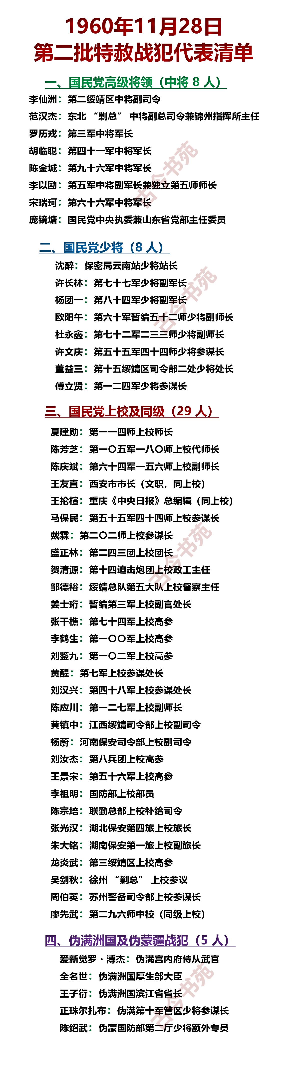 1960年,第二批战争犯罪人员,特赦名单一览! 第二批特赦战犯一共50人,沈醉就在这批名单里,此人是军统三剑客之一,老蒋的十大特务头子之一,也是10人里唯一被被捕接受改造的人。 除他之外,还有49人,国军中将8人,少将7人,国军上校级29人,以及伪满洲国和伪蒙疆5人。