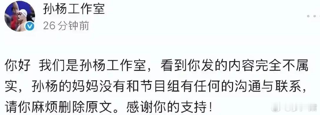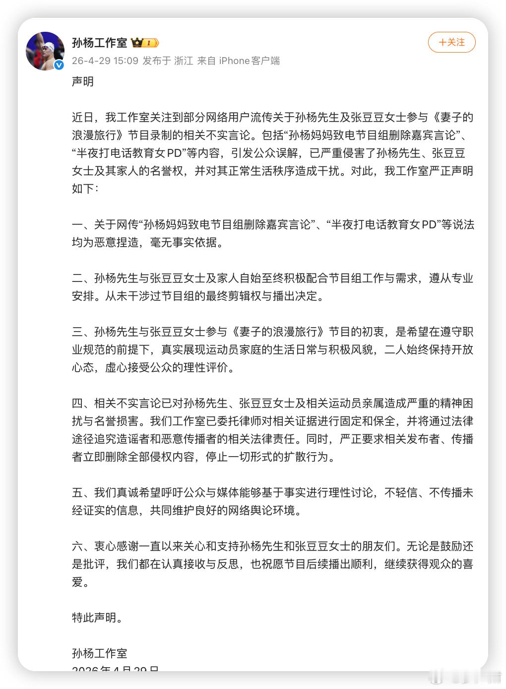 孙杨工作室称:“相关不实言论已对孙杨先生、张豆豆女士及相关运动员亲属造成严重的精神困扰与名誉损害。我们工作室已委托律师对相关证据进行固定和保全,并将通过法律途径追究造谣者和恶意传播者的相关法律责任。同时,严正要求相关发布者、传播者立即删除全部侵权内容,停止一切形式的扩散行为。”