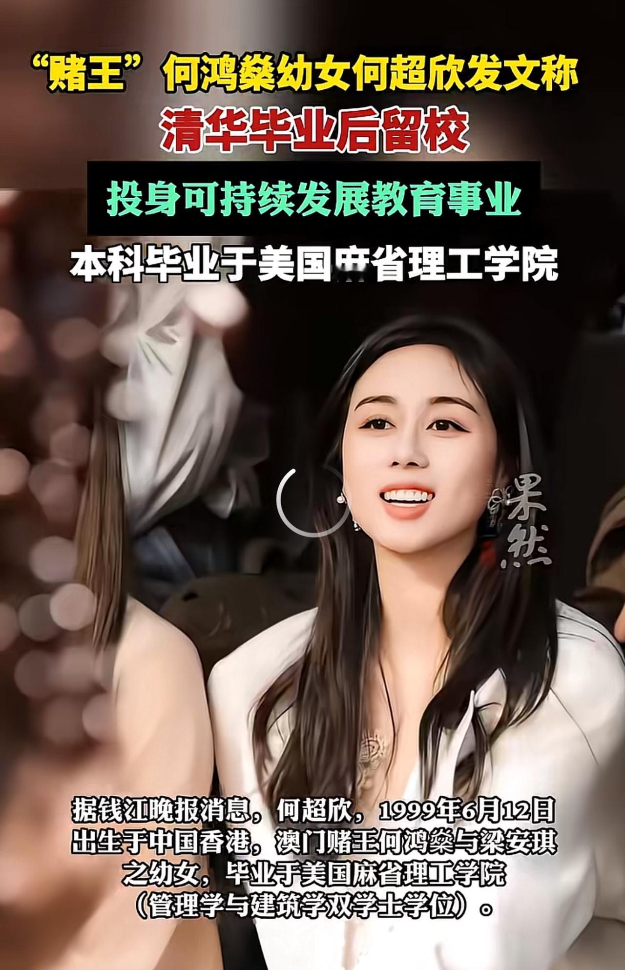 原来真正的豪门教育,是让孩子有选择自己人生的底气。 赌王的小女儿何超欣,最近在清华校庆上,官宣了自己的新身份——清华研究员,毕业后留校,投身可持续发展教育事业。 她的履历拿出来,真的太亮眼:本科麻省理工双学位,清华研究生毕业,明明可以靠家世躺平,却偏偏要靠自己的能力,走一条别人没走过的路。人家都这么努力了,我们还有什么理由躺平? 我们总觉得豪门的孩子,人生早就被安排好了联姻和继承,可何超欣却用行动告诉大家,真正的富养,从来不是给她多少家产,而是给她足够的底气,去选择自己想走的路。 比起嫁入豪门,她自己,就已经是豪门了。