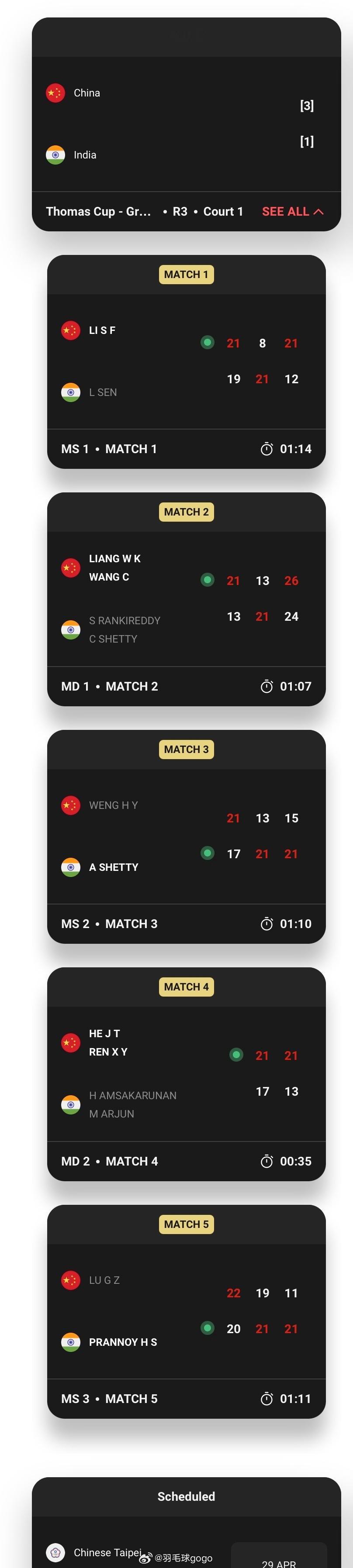 🇨🇳 3-2 🇮🇳李诗沣 21-19 8-21 21-12 拉克什亚梁伟铿/王昶 21-13 13-21 26-24 兰基雷迪/谢缇翁泓阳 21-17 13-21 15-21 阿尤什何济霆/任翔宇 21-17 21-13 哈里哈兰/阿琼陆光祖 22-20 19-21 11-21 普兰诺伊