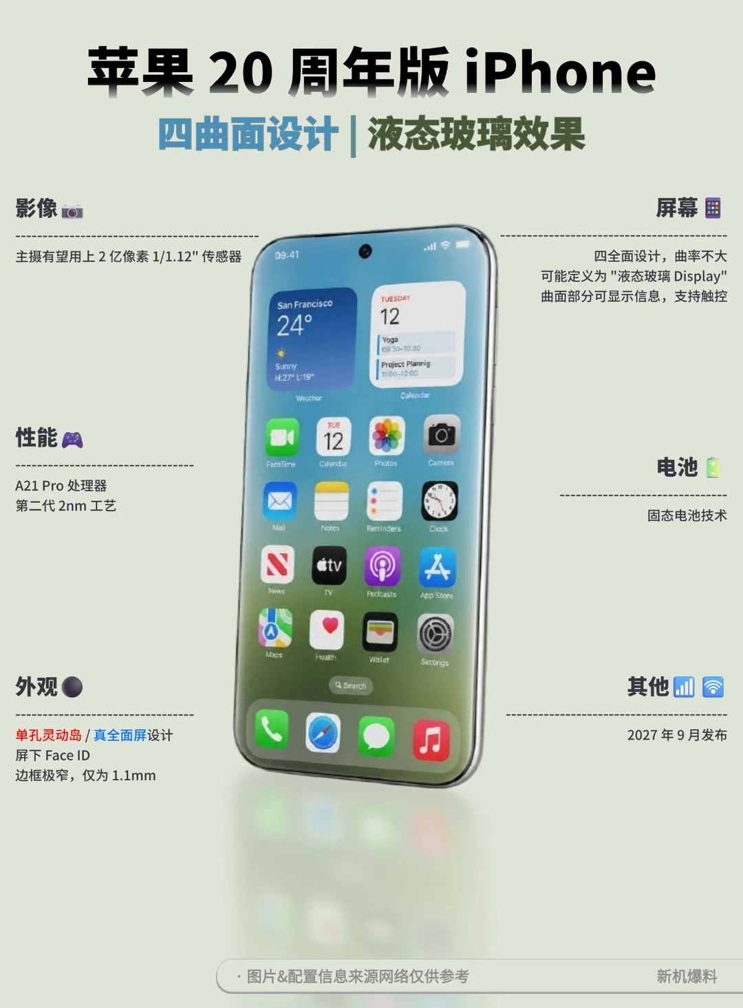 而除了上面提到的几款iPhone机型,苹果其他手机基本都是直角边框设计。而iPhone 20将迎来改变,采用四曲面设计,并通过光学折射实现“液态玻璃”观感。当然,其曲面部分依然能够显示部分信息及触控交互。