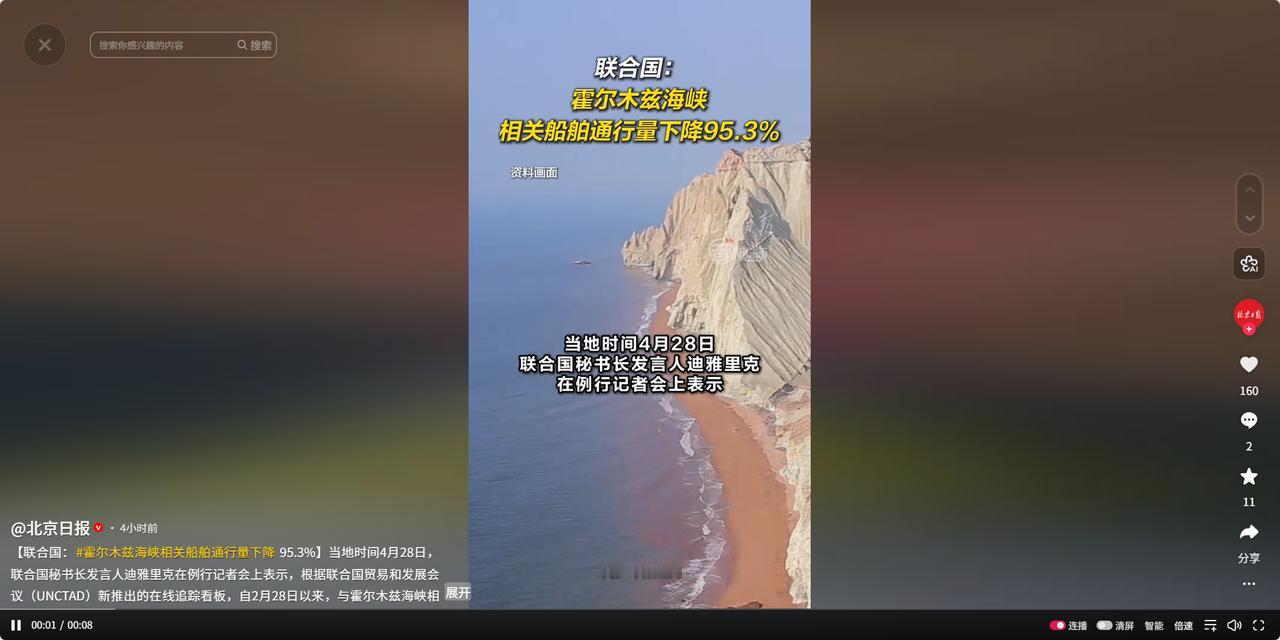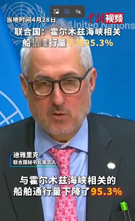 霍尔木兹海峡航运量暴跌95.3% 全球粮价油价受冲击大幅上涨 当地时间4月28日,联合国秘书长发言人迪雅里克在例行记者会上,对外公布了霍尔木兹海峡航运的一系列关键数据。 这组数据由联合国贸易和发展会议的在线追踪看板统计,精准反映了近两个月该海峡的航运动荡状况。 数据清晰显示,自2月28日起,霍尔木兹海峡关联的船舶通行量直接暴跌,降幅高达95.3%,几乎陷入全面停摆。 可能很多人对这个降幅没概念,简单说就是以前每天上百艘船过,现在只剩个位数,差距大到离谱。 霍尔木兹海峡可不是普通小海峡,它是全球能源和贸易的“咽喉要道”,承载着全球约五分之一的海上石油贸易。 这条狭窄水道连接波斯湾和阿曼湾,中东产油国的原油、天然气大多要经这里运往世界各地。 从2月28日开始,受地区局势升级影响,这里的航运活动直接被“掐断”,大量商船和油轮不敢贸然通行。 航运通道一旦堵死,连锁反应来得又快又猛,首当其冲的就是全球大宗食品价格,直接出现6%的涨幅。 很多人疑惑,海峡堵了跟粮价有啥关系?其实关联大着呢,全球化肥、粮食运输高度依赖这条水道。 欧洲本身能源自给率低,大部分原油依赖进口,霍尔木兹海峡堵死后,中东原油运不出去,欧洲市场供应直接告急。 很多人可能觉得中东的海峡动荡离自己很远,其实全球化时代,没有谁能独善其身,每一个国际关键通道的变化,都会影响到我们的柴米油盐。 从2月底到4月底,短短两个月时间,霍尔木兹海峡的航运危机,已经从地区事件演变成影响全球经济的重要变量。 联合国公布的这组数据,更是给全球敲响了警钟,能源安全、粮食安全从来都不是单一国家的事,而是全人类的共同课题。 未来霍尔木兹海峡局势如何演变,航运能否恢复正常,全球粮价和油价是否会继续上涨,还需要持续关注后续发展。 但可以肯定的是,只要这条全球“能源咽喉”一天不通畅,全球经济就一天要面临来自供应链和通胀的双重压力。 我们普通人能做的,就是多关注国际局势变化带来的影响,理性看待物价波动,同时也能更深刻理解全球化下“牵一发而动全身”的道理。