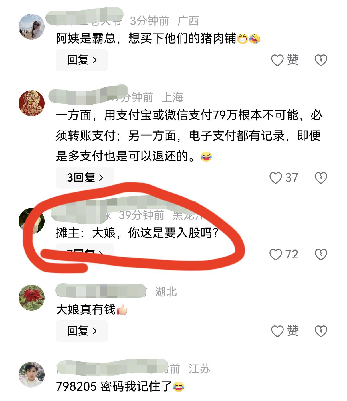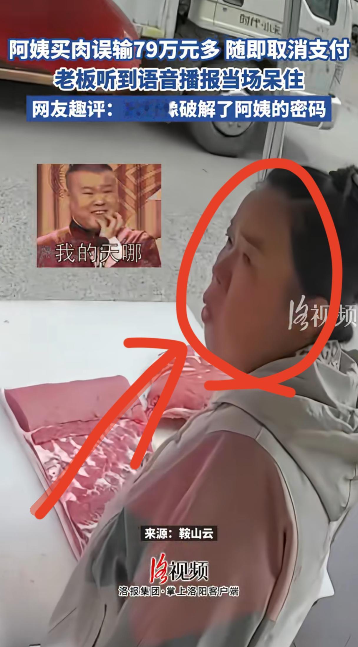 买肉花了79万, 这是什么体验? 天津一阿姨, 4月26日在菜市场买肉,手指一抖,屏幕上跳出一串数字:798205元。 语音播报响彻整个摊位:“顾客取消支付七十九万八千二百零五元”。 老板当场就傻了。肉才几十块,阿姨这一输就是79万。79万买肉,这肉是镶金边了还是裹钻石了? 老板后来接受采访,说了一句话,全网都在笑: “她敢付,我都不敢收。” 还好阿姨手快,支付直接取消了。不然老板得卖多少肉才能找开这79万? 事情发生在4月26日,天津某菜市场。阿姨买完肉,扫码,手指不知道咋回事就多敲了几个零。语音一响,老板整个人都愣住了。 最绝的是网友的评论, 直接冲上热评: “我好像破解了阿姨的密码。” 这话啥意思?阿姨手机支付密码六位数,79万输进去——仔细一对,中间六位还真对上了。密码也太好猜了吧? 还有人说:“阿姨这是把买菜钱和买房钱搞混了。” 笑归笑,仔细想想,阿姨估计也吓出一身冷汗。79万,真付了,追回来得多折腾?还好取消了,不然真是吃不了兜着走。 阿姨买肉误输79万多随即取消支付