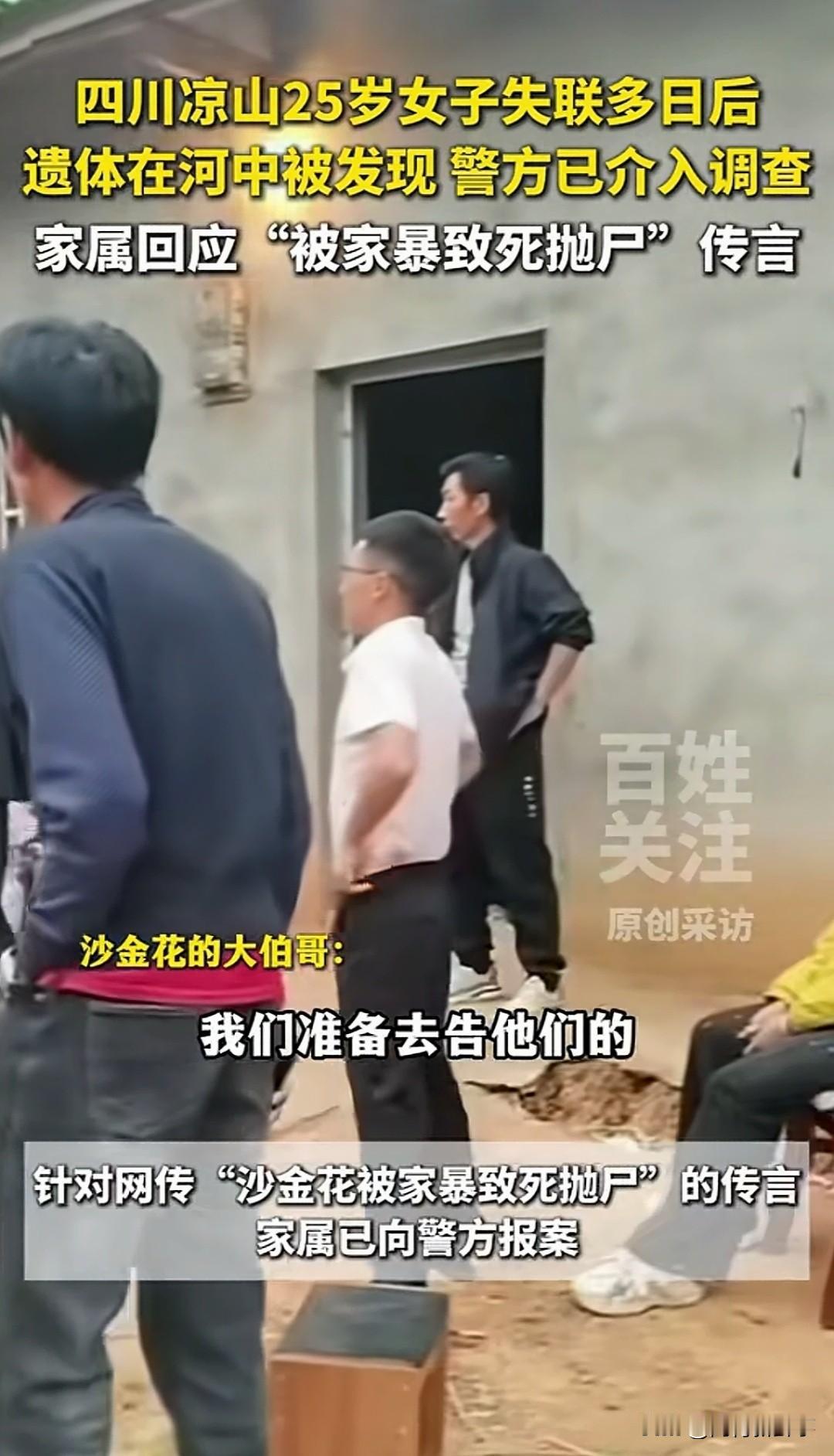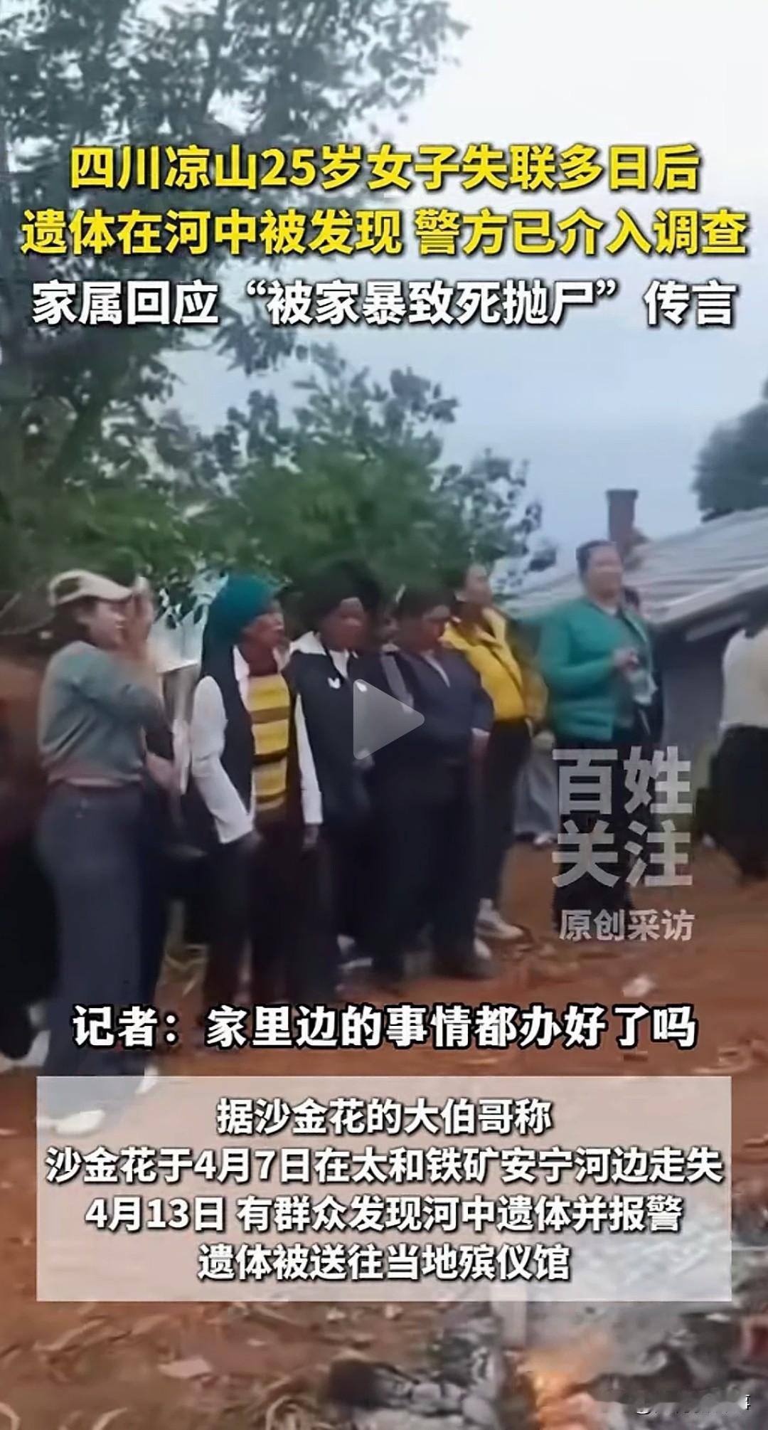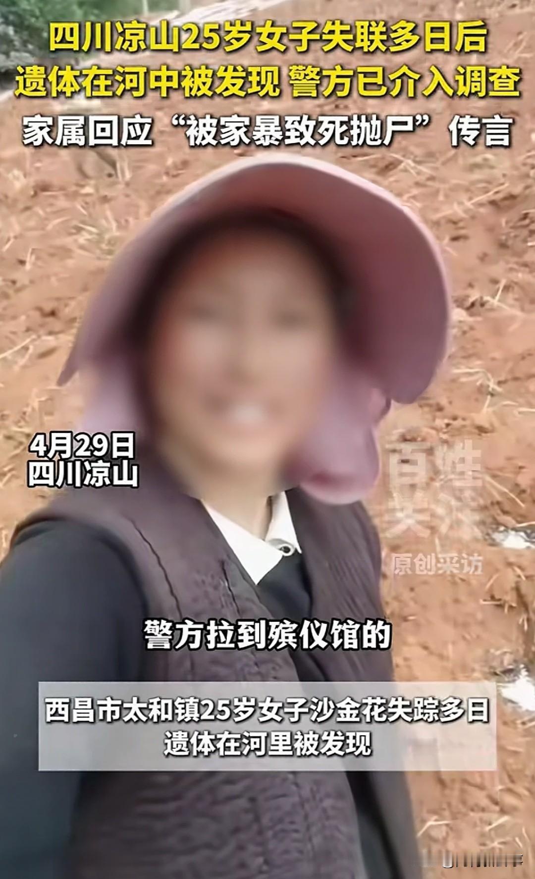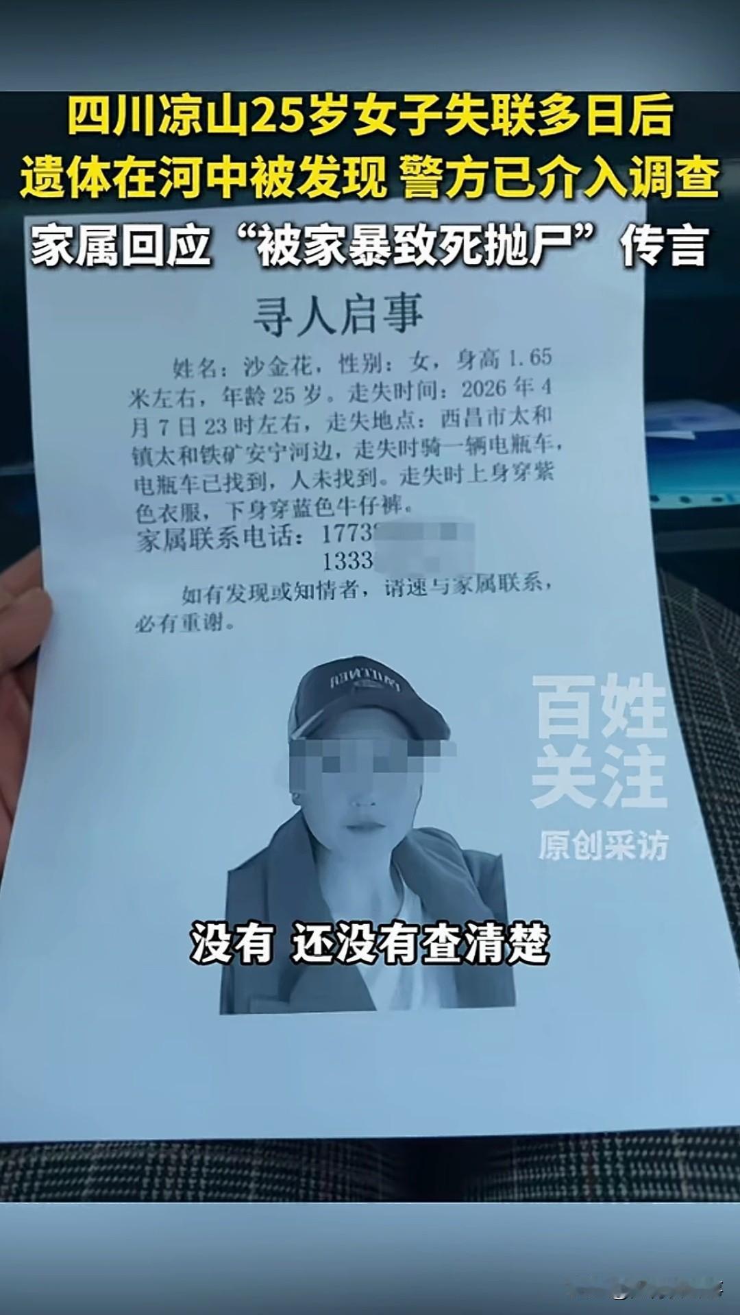 四川凉山这起悲剧,全网都在等一个真相 家属已就网传谣言报警,警方已全面介入调查 事发四川凉山州西昌市太和镇,失联的女子今年刚满25岁。 4月7日,她在太和铁矿附近的安宁河边走失,家人立刻四处寻人。 寻人启事发遍了全网,可最终等来的,却是最让人痛心的结果。 4月13日,有群众在安宁河河道中发现遗体,第一时间报警求助。 经家属现场确认,逝者正是失联多日的25岁女子,遗体已送往当地殡仪馆。 因为案件尚未查清,逝者的丈夫情绪彻底崩溃,需要专人24小时看护,葬礼至今暂未办理。 针对网上流传的家暴致死抛尸传言,家属已经正式向警方报案,坚决抵制谣言扩散。 4月29日,当地镇政府回应,警方已对事件展开全面调查,案件办理工作正在稳步推进。 一条鲜活的生命戛然而止,背后是一个家庭的彻底破碎。 我们不信谣不传谣,唯一的期盼,就是警方能尽快查清全部真相,给逝者和家属一个公道。 面对这类悲剧事件,你会自觉抵制未经证实的网传谣言吗?社会热点
