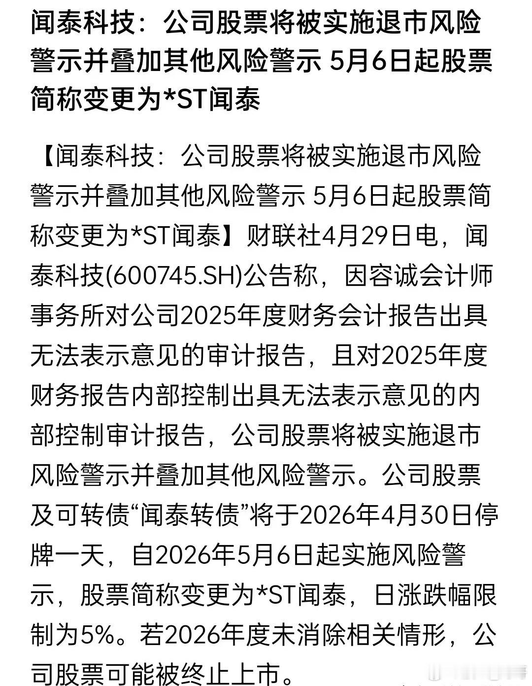 且如果闻泰科技不能在2026年末消除相关情形,股票将被退市!