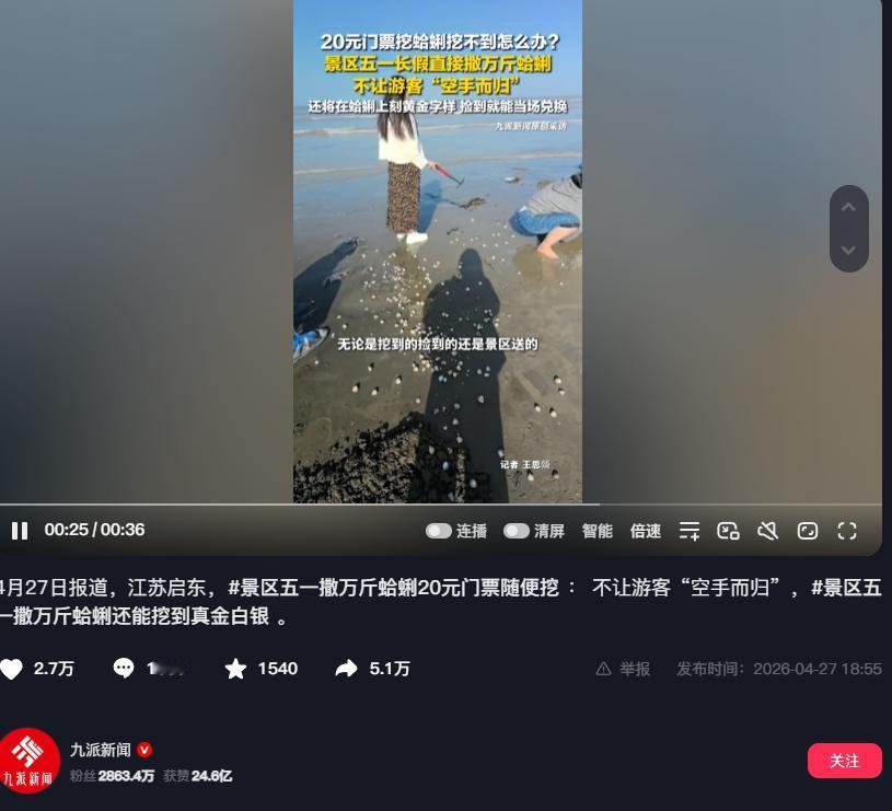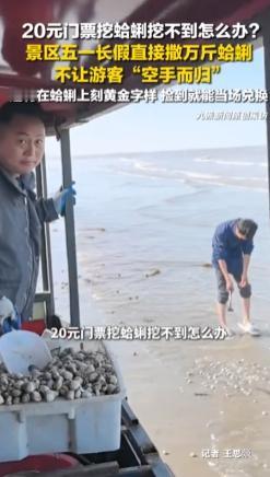 可以捡黄金的景区?4月27日报道,黄金海滩撒1万斤“隔离”藏惊喜,挖到刻字款直接兑真金,工作人员贴心相助,无套路不涨价,网友:这才是景区该有的样子,性价比拉满! 黄金海滩的撒蛤蜊玩法,并非今年的突发奇想,早在去年,景区就已经开始尝试这种接地气的福利模式,心甘情愿承担这笔不小的开支,只为让每一位游客都能满载而归,不至于乘兴而来、败兴而归。 今年五一长假,景区更是加码升级,计划共计撒出1万斤蛤蜊,这份诚意在当下竞争激烈的旅游市场中,显得格外难得。 不同于其他景区靠低价门票、网红打卡点博眼球的套路,黄金海滩选择把钱直接花在游客身上,用最实在的方式吸引关注。 不少游客会特意带着桶前往景区,只为多收集一些蛤蜊,景区工作人员也十分贴心,见状会主动帮忙将蛤蜊装进游客的桶里,省去大家弯腰捡拾的麻烦。 尤其是小朋友,只要手里能拿到东西,不管是自己亲手挖到的、路边捡到的,还是工作人员主动赠送的,都能笑得格外开心,这份简单的快乐,也让不少家长倍感暖心。 当然,最让游客心动的,并非蛤蜊本身,而是藏在其中的“黄金惊喜”。 景区会用激光打印机,在部分蛤蜊上刻上“黄金一克”“黄金0.5克”等字样,游客只要捡到带有这类标识的蛤蜊,无需复杂流程,直接找景区工作人员,就能当场兑换货真价实的黄金和白银,没有任何隐形套路,实打实的福利送到游客手中。 有人难免会疑惑,景区撒这么多蛤蜊,还要承担黄金白银的兑换成本,难道不会亏本吗?其实不然,这看似“亏本”的操作,本质上是一种精准的营销手段。 景区用一笔可控的成本,换来了极高的关注度和良好口碑,游客前来挖蛤蜊的同时,难免会在景区内消费,无论是餐饮、住宿,还是周边产品,都能为景区带来额外收益,长远来看,完全是双赢的局面。 回顾去年五一,黄金海滩就靠这种“撒蛤蜊、换黄金”的玩法,吸引了大量游客慕名前往,不少游客反馈,不仅体验到了挖“蛤蜊的乐趣,还意外兑换到了黄金,性价比直接拉满。 也正是因为去年的良好效果,今年景区才继续加码,推出1万斤蛤蜊的福利活动。 如今的游客出游,早已不满足于单纯的看风景,更注重游玩的体验感和参与感。 挖蛤蜊的过程,既能让游客动起来,感受寻找惊喜的乐趣,对于家庭游客来说,更是一种绝佳的亲子互动方式,大人小孩都能乐在其中,这也是该活动受欢迎的核心原因。 毕竟,既能免费游玩景区,又有机会收获实打实的黄金白银,这样的好事,很难让人拒绝。 面对黄金海滩的这波操作,网友们议论纷纷,看法各不相同。 有网友直言:“这才是景区该有的样子,不玩虚的,直接给游客送福利,比那些只会涨价、搞隐形消费的景区强太多,五一必冲!” 也有网友调侃道:“1万斤蛤蜊,就算换不到黄金,带着孩子体验一下挖东西的快乐也很值,主打一个参与感拉满。” 不过也有部分网友提出了疑问:“这么多蛤蜊撒在地上,会不会造成浪费?兑换黄金的规则到底有没有猫腻,会不会出现兑不了的情况?” 总体而言,网友们的正面评价占据大多数,大家对这种实在的景区福利普遍表示认可,也十分期待五一期间能亲自前往体验。 至于有游客担心的“支援门票挖不到蛤蜊的问题,其实完全无需顾虑。 景区撒出的1万斤蛤蜊数量充足,只要愿意花点时间寻找,基本都能有所收获,再加上工作人员会主动帮忙、赠送,绝对不会让任何一位游客空手而归,这份贴心,也让黄金海滩在众多景区中脱颖而出。 那么这样的景区,你们想去玩吗? 如果各位看官老爷们已经选择阅读了此文,麻烦您点一下关注,既方便您进行讨论和分享,又能带来不一样的参与感,感谢各位看官老爷们的支持! 信息来源:九派新闻《4月27日报道,江苏启东,景区五一撒万斤蛤蜊20元门票随便挖 : 不让游客“空手而归”,景区五一撒万斤蛤蜊还能挖到真金白银 。》