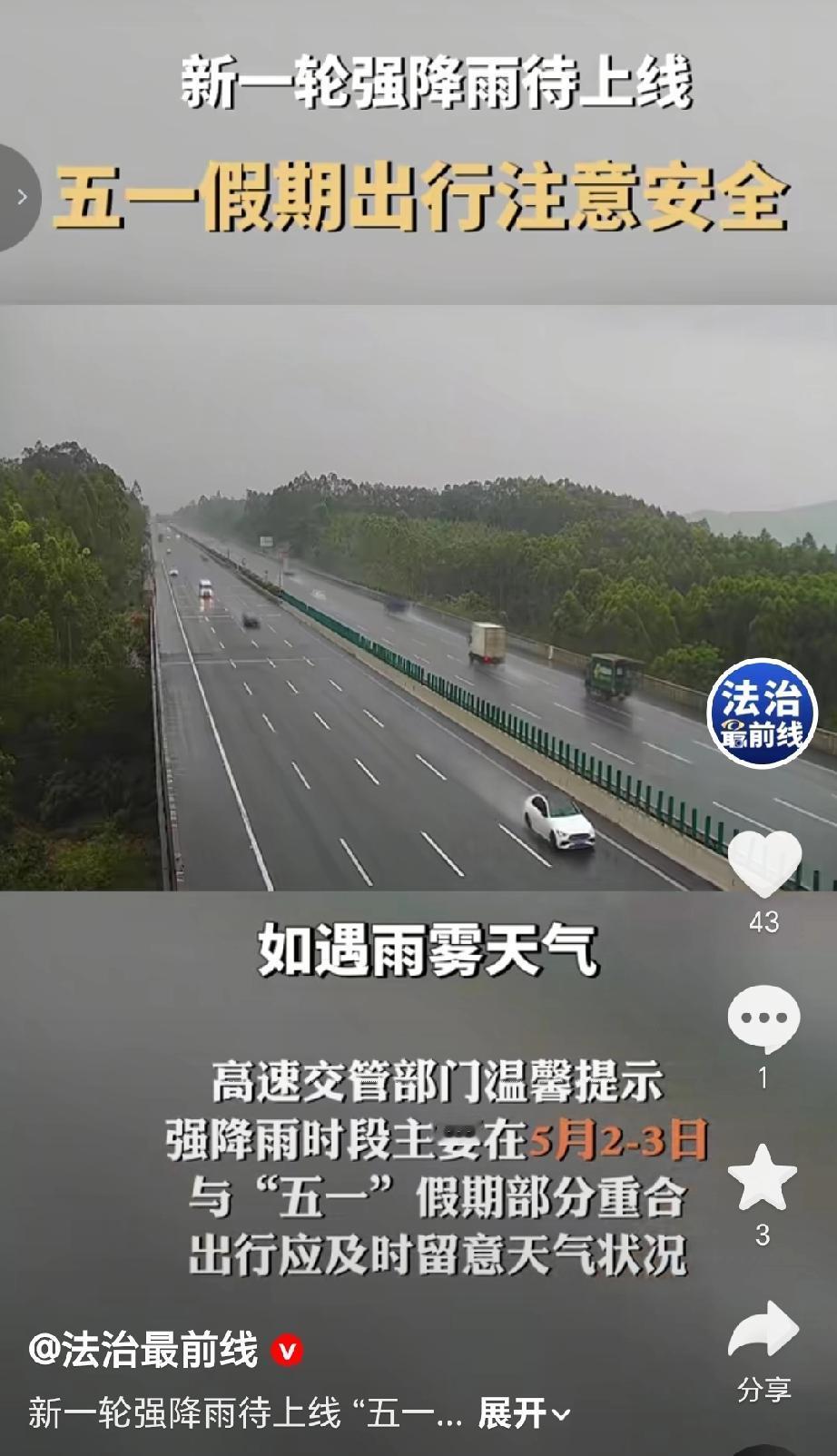 广西高速交警温提醒,“五一”假期前及假期期间,广西将迎新一轮强降雨,可能伴随强对流天气(雷电、短时大风等)自驾/高速:避开易积水路段(如山区隧道口、低洼桥面),关注“广西交通出行”公众号实时拥堵及管制信息;户外游玩:避免前往山区、河谷、地质灾害隐患点(如桂林阳朔、河池巴马等喀斯特地貌区域),提前查询景区关闭公告,需了解更多天气情况关注“广西气象”“应急管理厅”官方通报。(来源于@法治最前线)