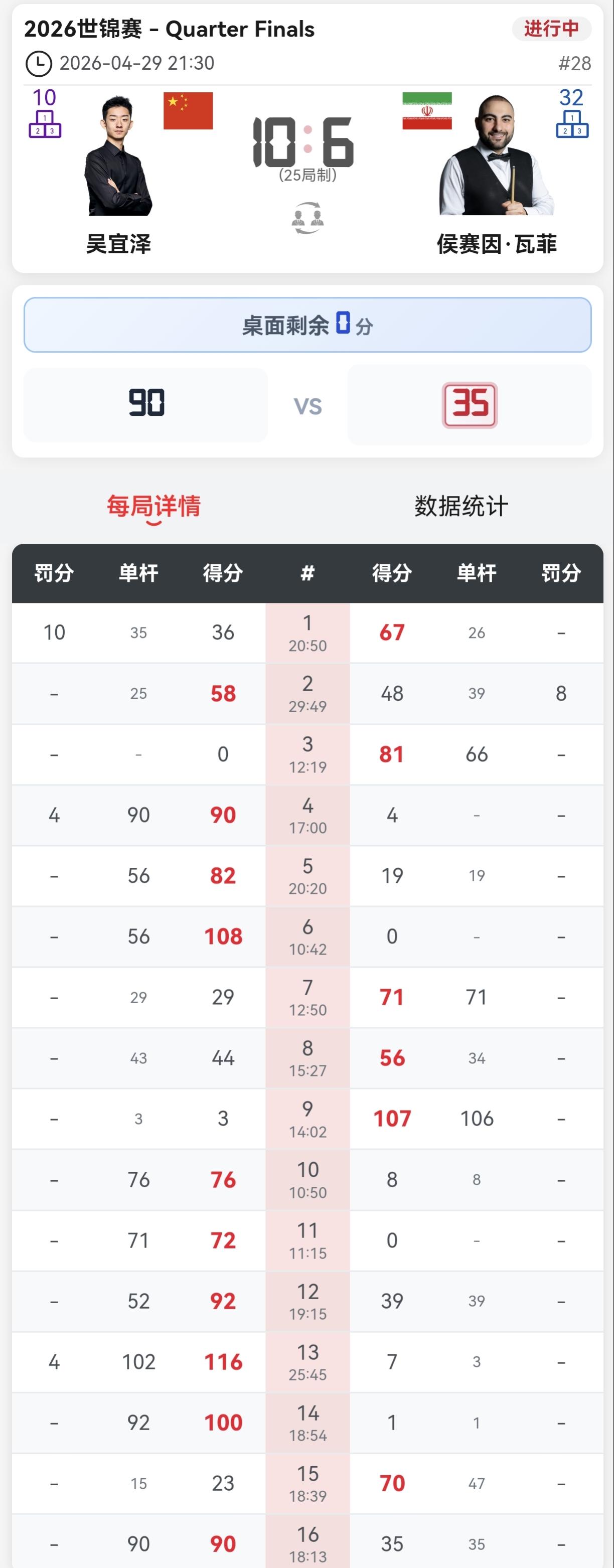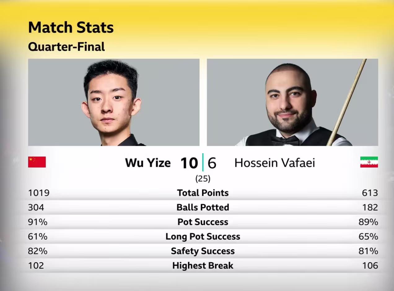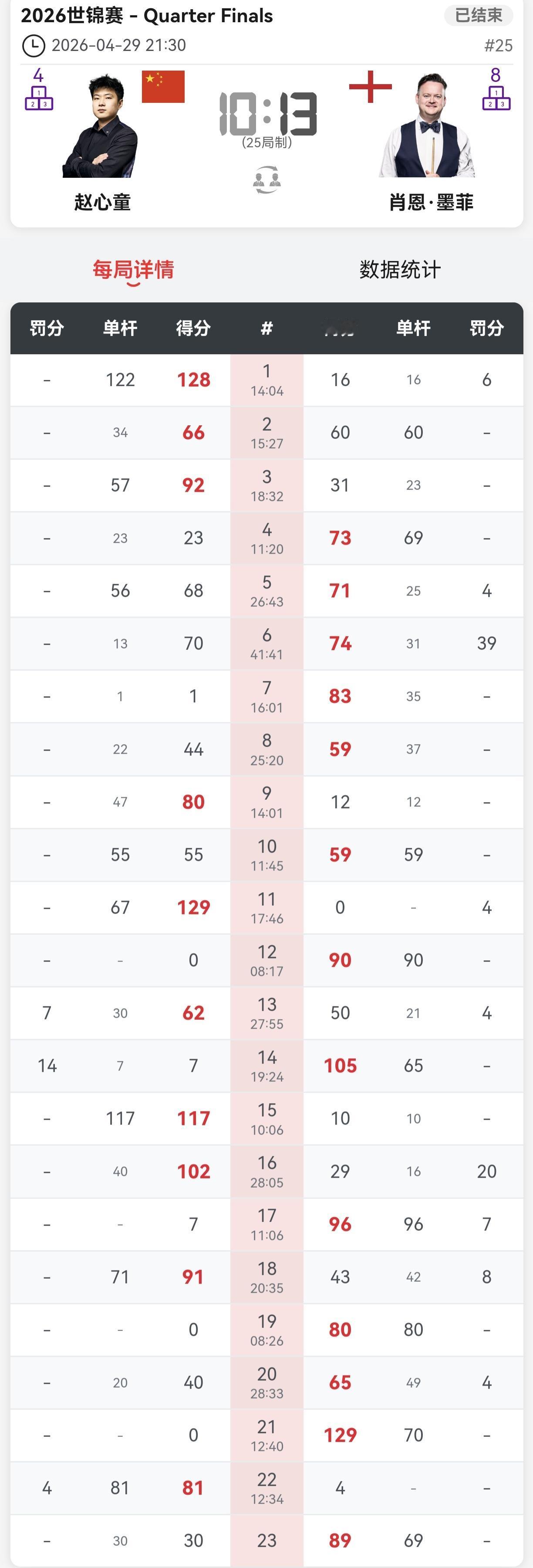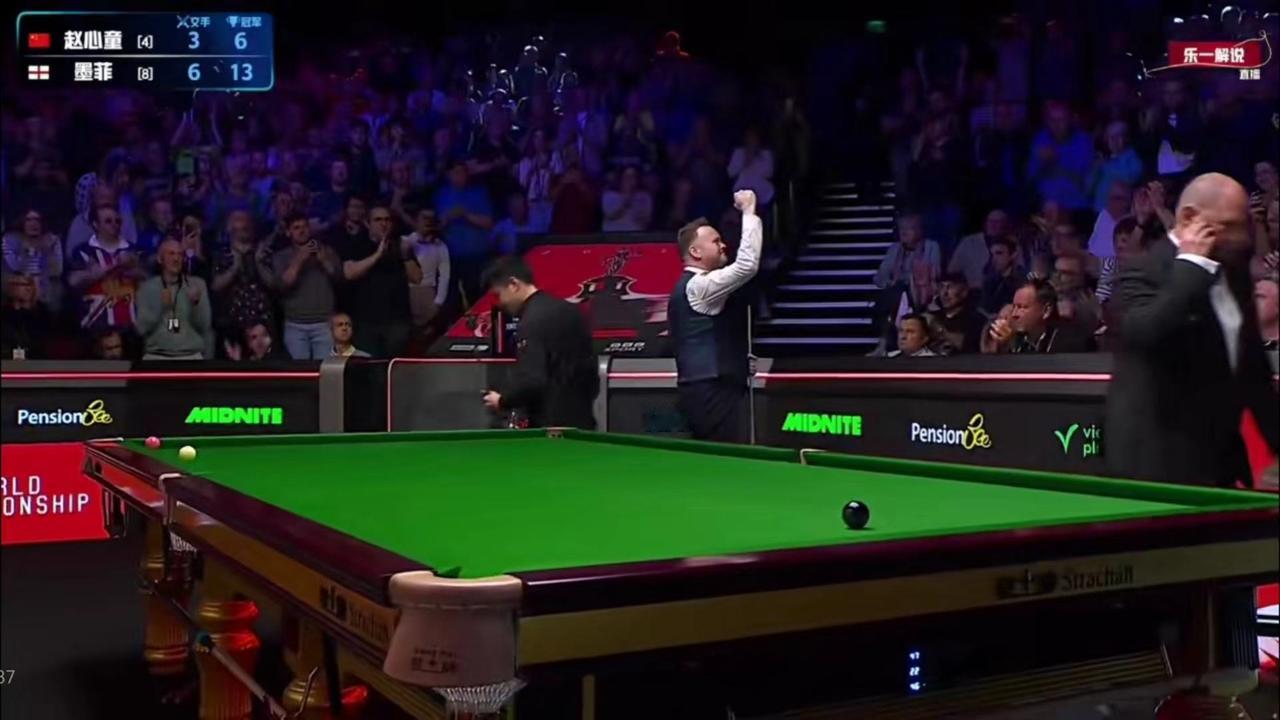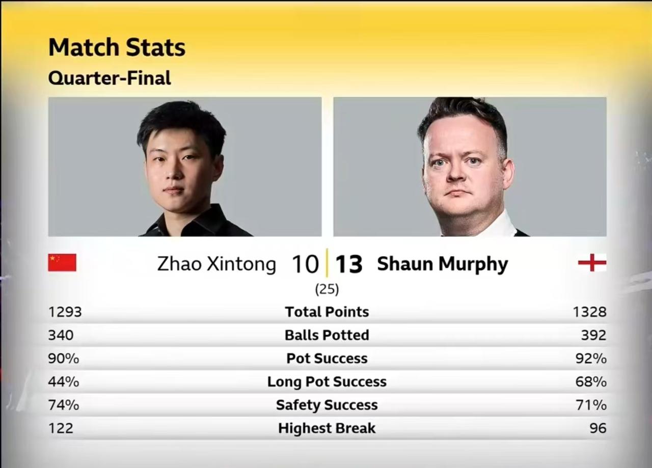克鲁斯堡魔咒,无人能够跨越。赵心童1/4决赛,10-13无缘继续前进。 第二阶段,赵心童把比赛扳成8-8平手。 第三阶段一开始,赵心童长台没打进,留下了一个不是机会的机会。墨菲打进中袋,单杆96分,比分扩大到一局。 第18局,赵心童凭借超级准度,单杆71分,扳回一局,再度平手。 第19局,赵心童开球漏长台,被墨菲一杆带走。 之后进入了墨菲模式,墨菲准度惊人,无论有多远,无论有多难,没有打不进的球,直接三连鞭。12-9拿到赛点。 赵心童奋力拼搏,凭借无所畏惧的击球,单杆81分拿回一个赛点。 最后一局,赵心童拼中袋不进,被墨菲拼进,一杆超分。赵心童没有放弃,做了几杆斯诺克,最终被墨菲打进。 整体而言,除了第一阶段,赵心童基本上还是发挥了自己的水平。 但是进攻端,墨菲更准。而且墨菲独创的开球,也让赵心童陷入困境。第三阶段,墨菲机会没有失误,打进一切能进的球。基本进入无敌模式,赵心童输得也不冤。 赵心童本赛季也是可圈可点,期待下个赛季发挥更好。 另外一场,吴宜泽10-6领先瓦菲,一度打出5连鞭。 艾伦则是13-11战胜霍金斯,率先进入4强。 凌晨两点,吴宜泽对阵瓦菲继续。