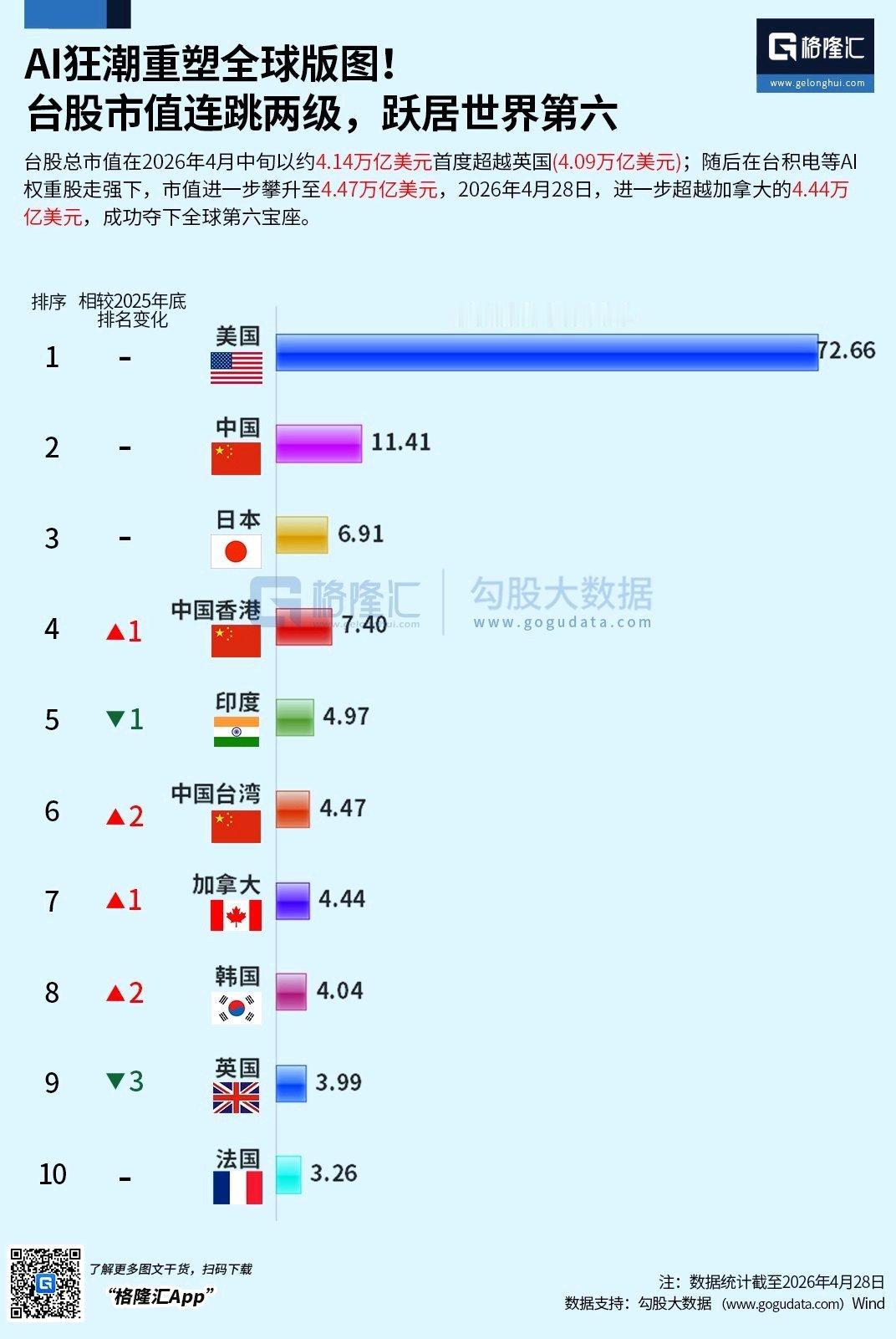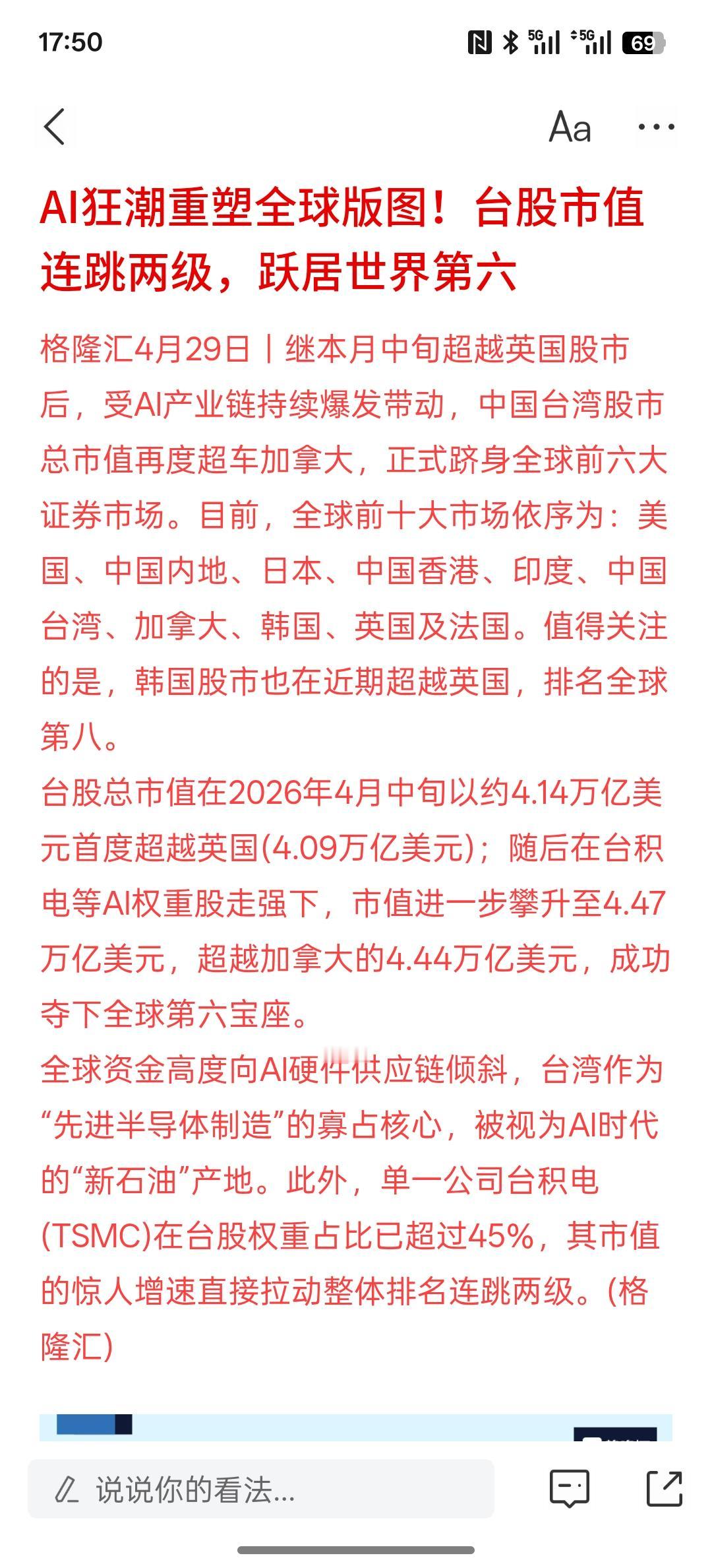 AI狂潮重塑全球版图!台股市值连跳两级,跃居世界第六,最近,台湾股市大幅的上涨,而且创新高,而韩国的股市,日本的股市同样继续创新高! 这一轮股市的上涨主要是AI人工智能所带来的科技公司内的估值上涨!全球范围内主要是AI人工智能,带动了整个科技产业链的发展以及芯片半导体持续发展,带动了数据算力的发展,也带动了其他消费电子产品发展机遇!
