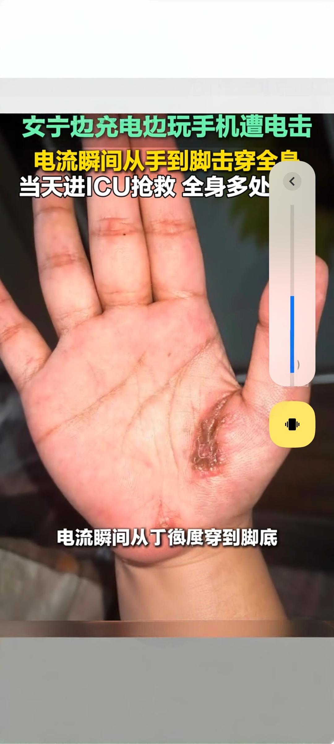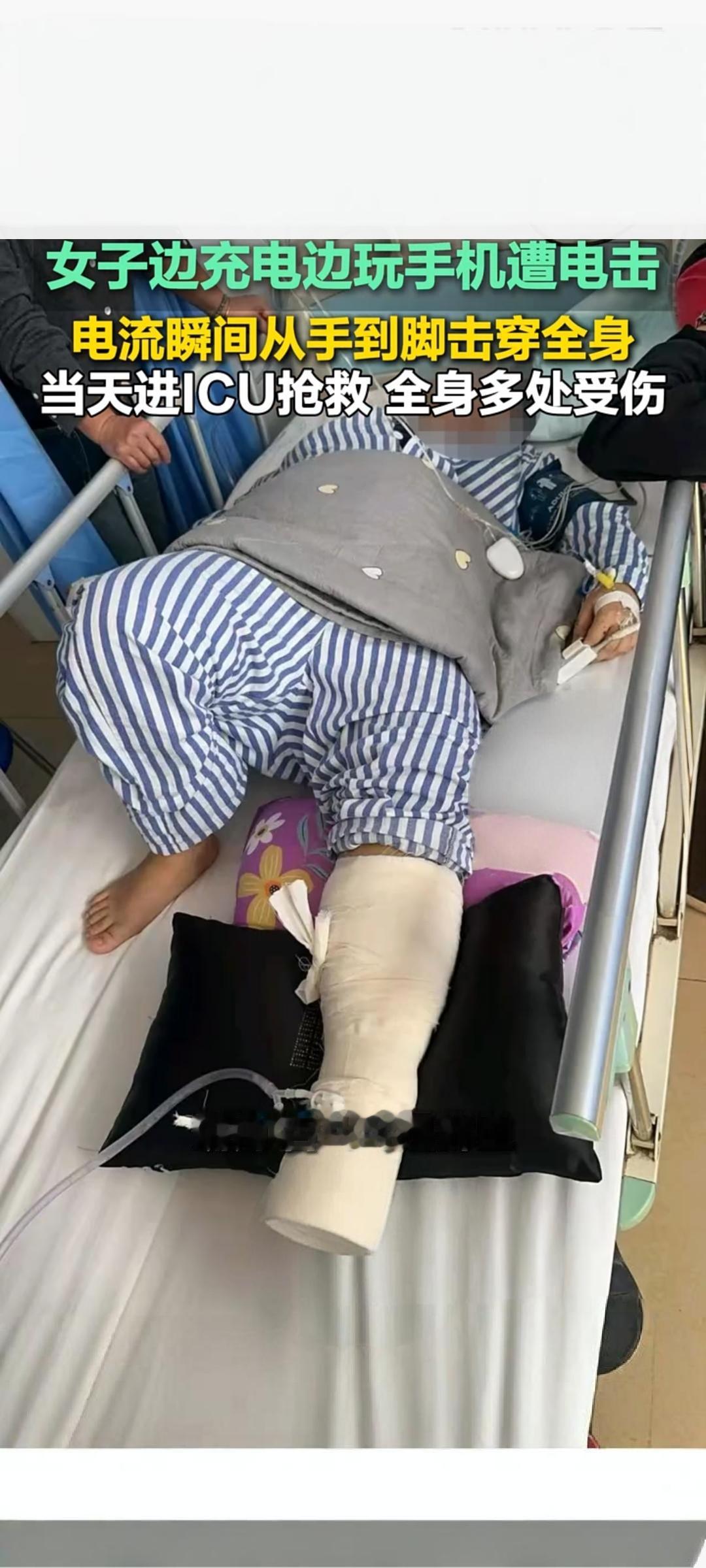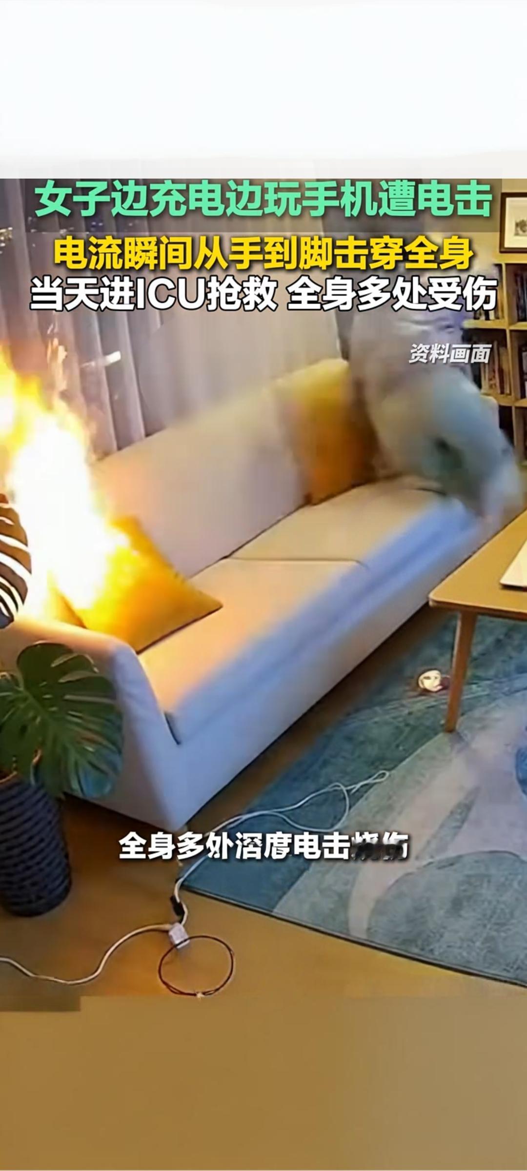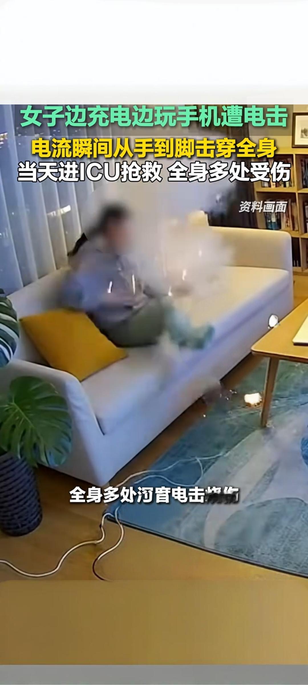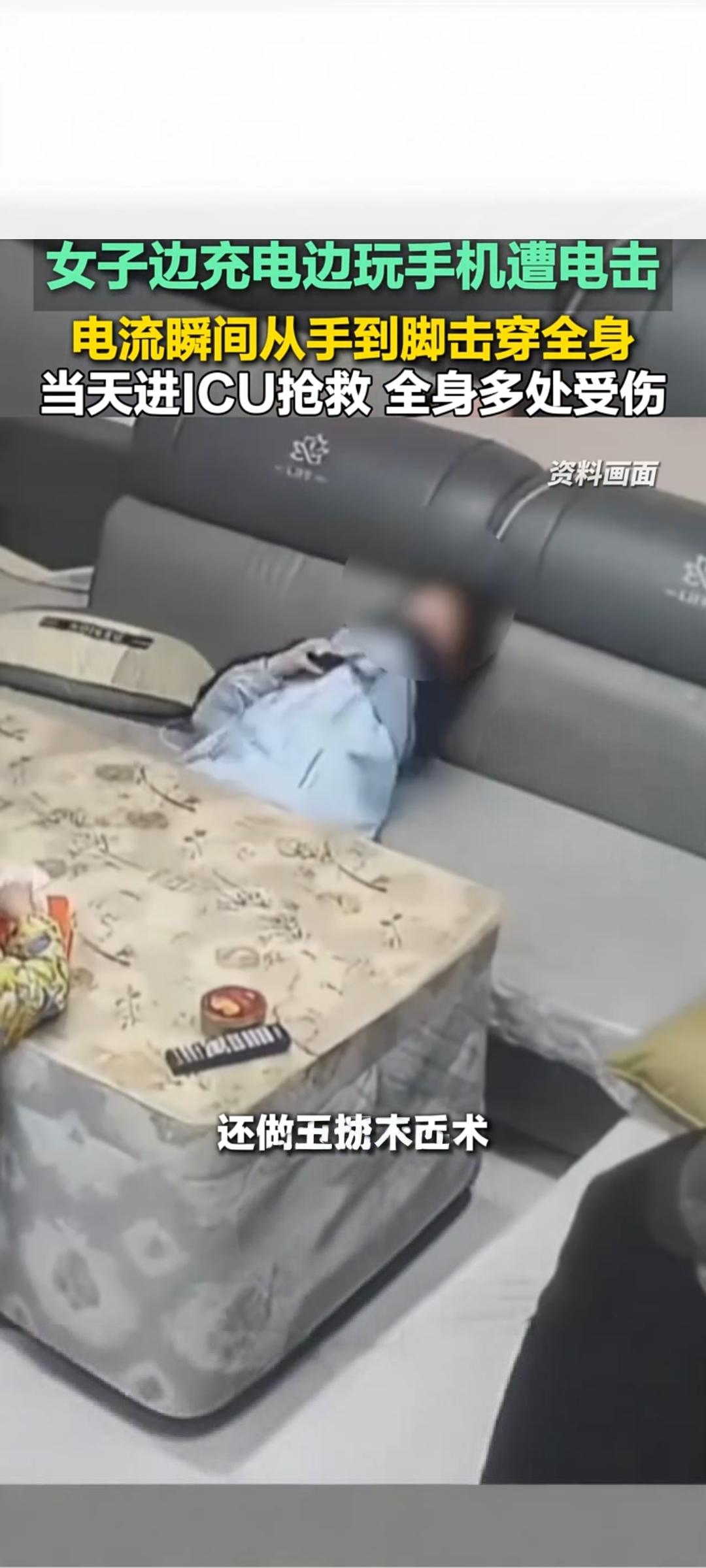 女子边充电边玩手机遭电击 电流贯穿全身紧急送医 近日,贵州遵义发生一起因边充电边玩手机引发的电击事故,一名女子被电流瞬间从手到脚击穿全身,当天送入ICU抢救,引发广泛关注 。 据了解,事发于3月5日,当事人孙女士在家中沙发上边充电边刷手机视频,脚部搭在烤火炉上。突然,她感到身体失控,电流快速贯穿全身,形成循环电击,持续数分钟无法动弹、无法呼救。所幸其表弟及时发现,迅速切断电源并送医。 经诊断,孙女士全身多处遭电击伤,烧伤面积3%,为深II°至III°,右手掌形成电流入口焦痂,左足为电流出口,口唇、舌部均有创面,伤势严重,当天即转入ICU抢救,次日才转至普通病房,住院半个月后康复出院。接诊医生表示,此类严重电击病例十分罕见,自己也是首次遇到。 此次事故疑与使用非原装充电设备、充电时使用手机及身体接触导电物体有关。医生提醒,边充电边玩手机存在极大安全隐患,劣质充电器易引发漏电,充电状态下手机发热会加剧风险。公众应使用原装合格充电配件,避免边充边用,远离金属等导电物体,严防意外发生 。 女孩边充电边玩手机 手机引发电穿事故 全身被电被击穿 不要边充电边玩手机