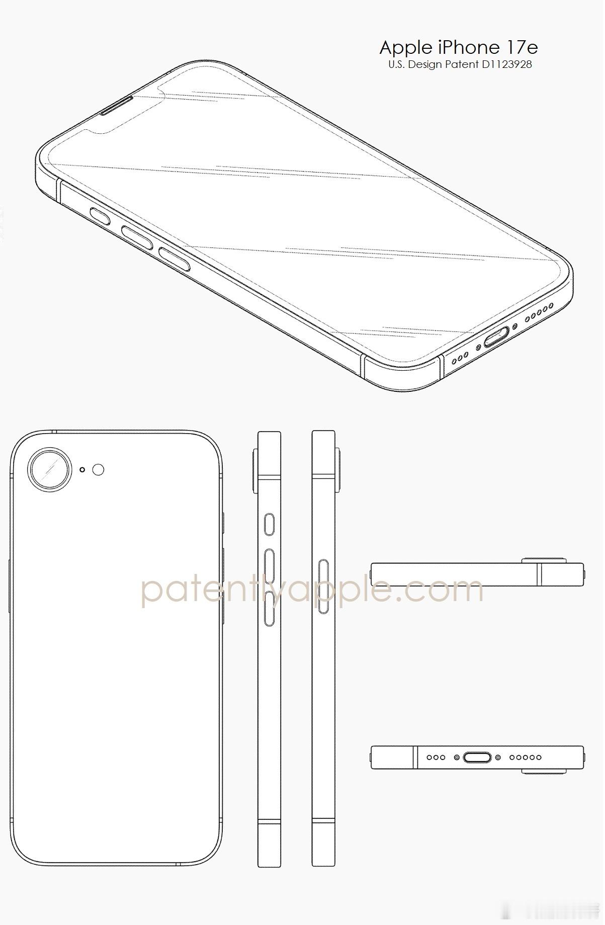 这张图片是Apple向美国专利商标局提交的iPhone 17e外观设计专利文件(专利号D1123928),完整呈现了这款iPhone的外观方案。