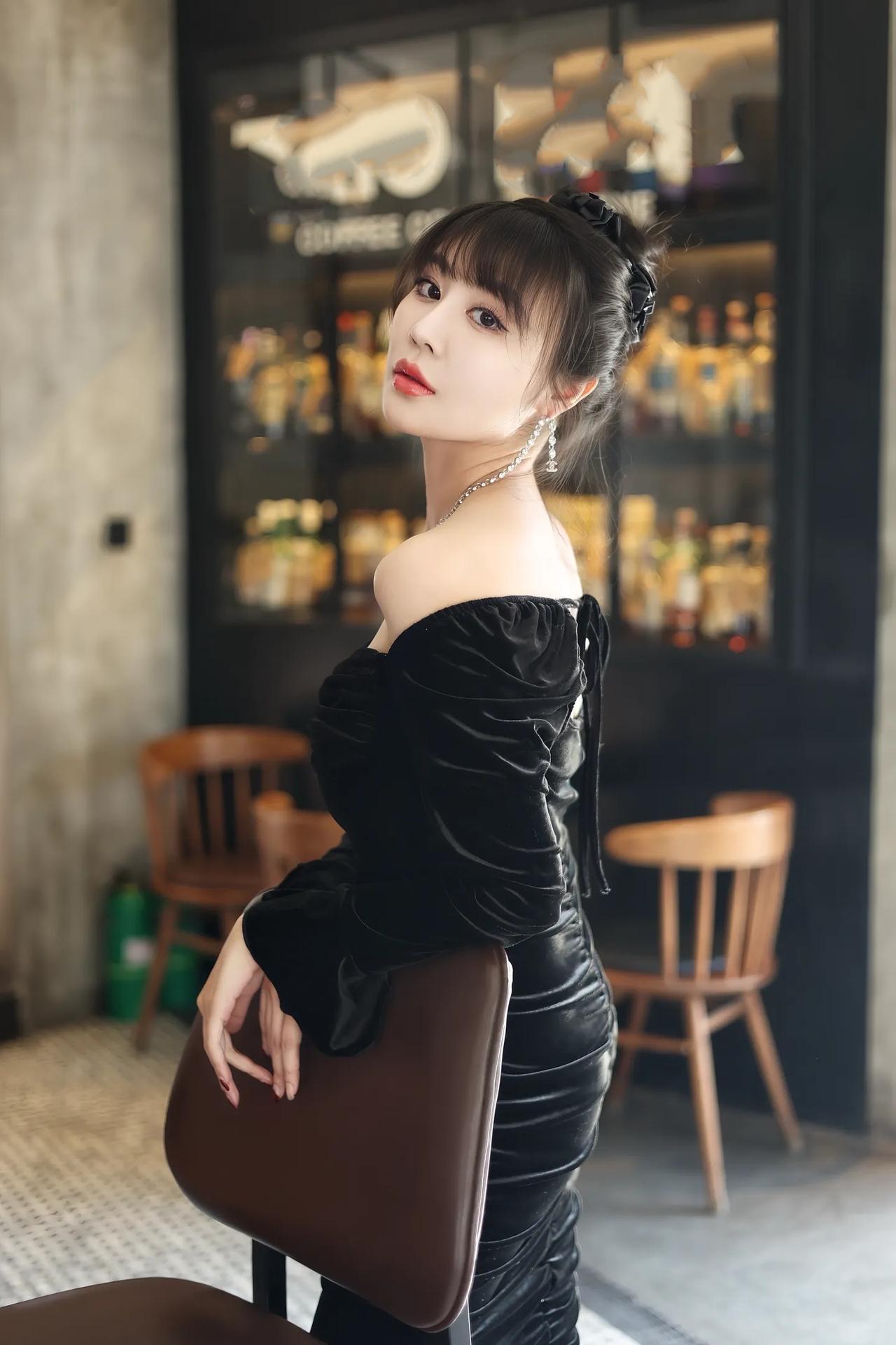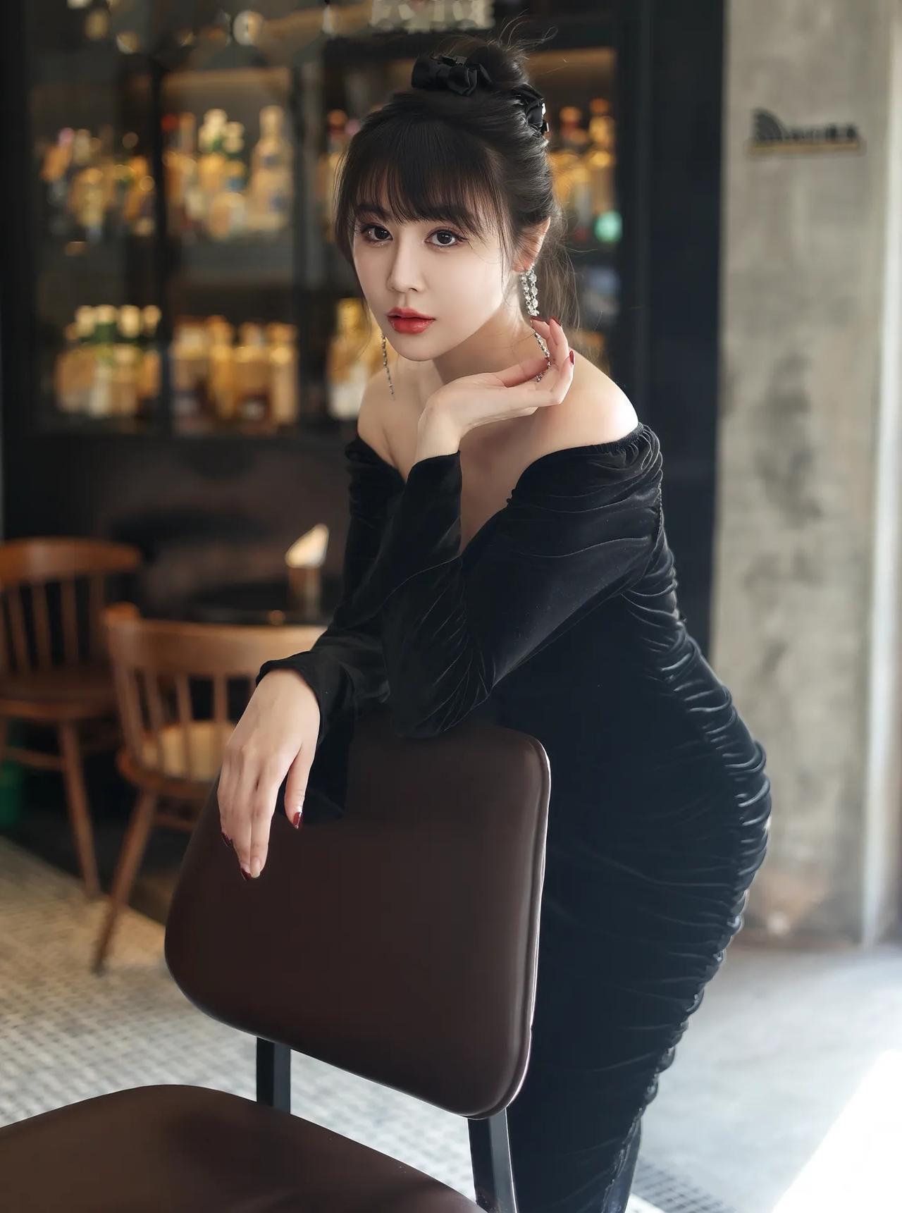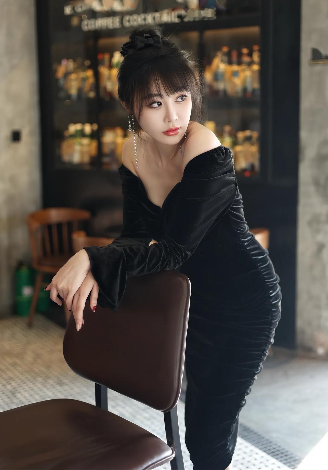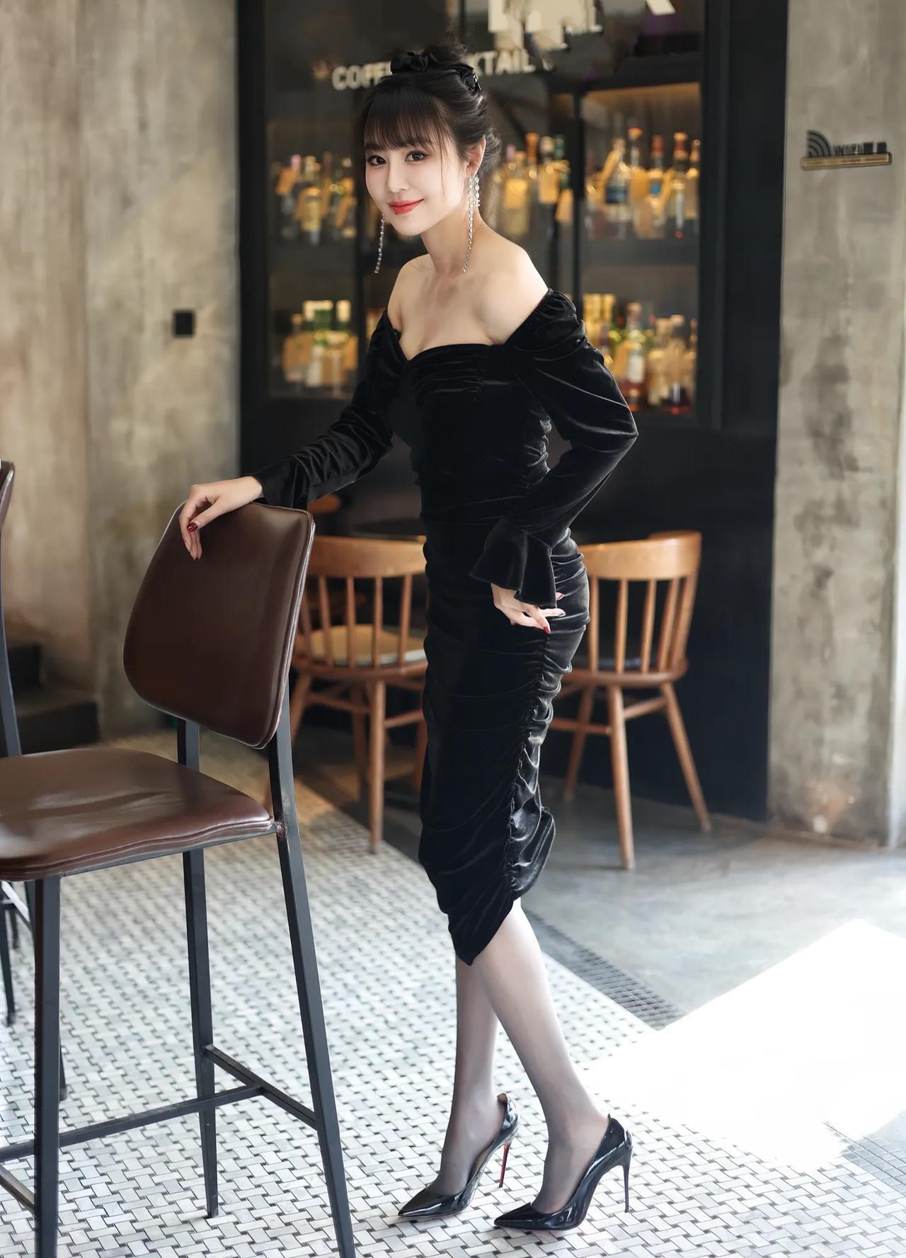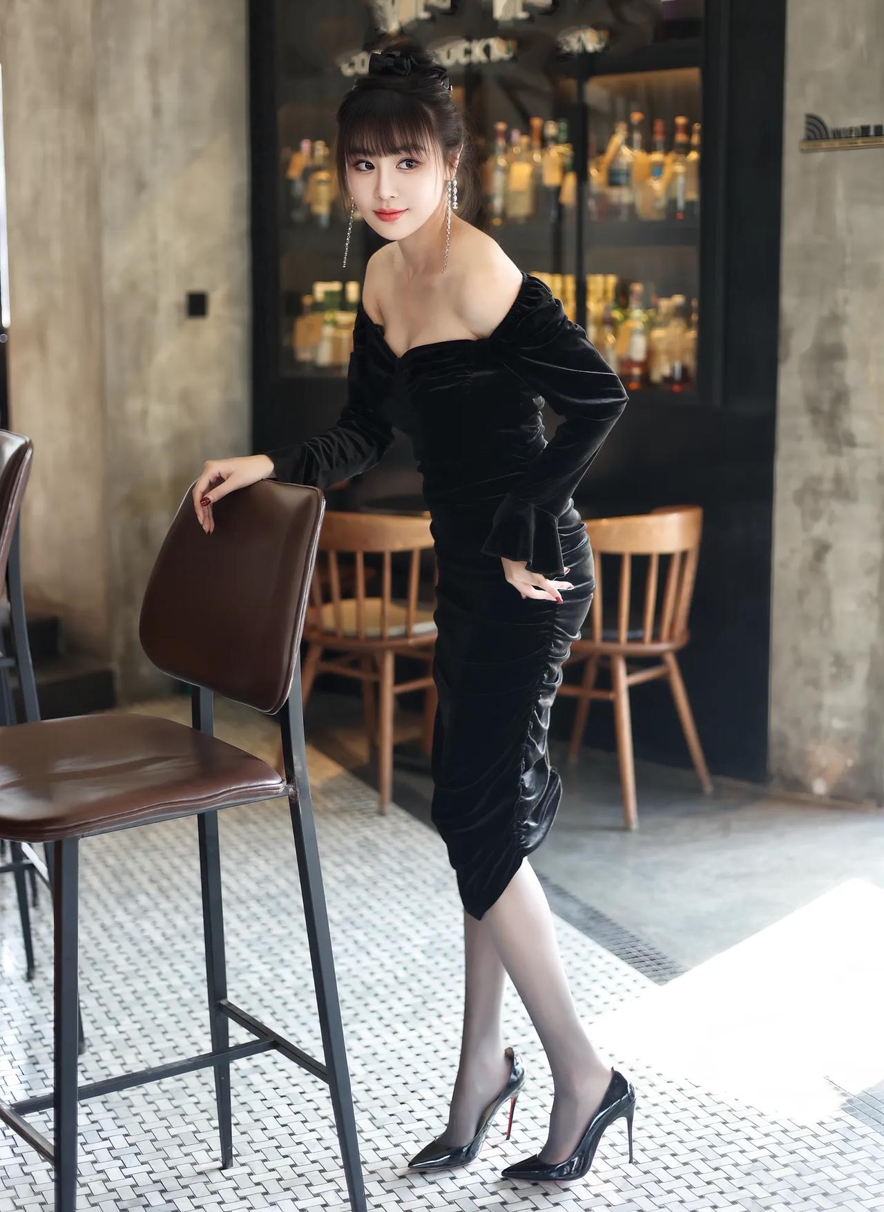 一袭黑色包臀连衣裙配黑色高跟鞋,展现性感和优雅气质。
