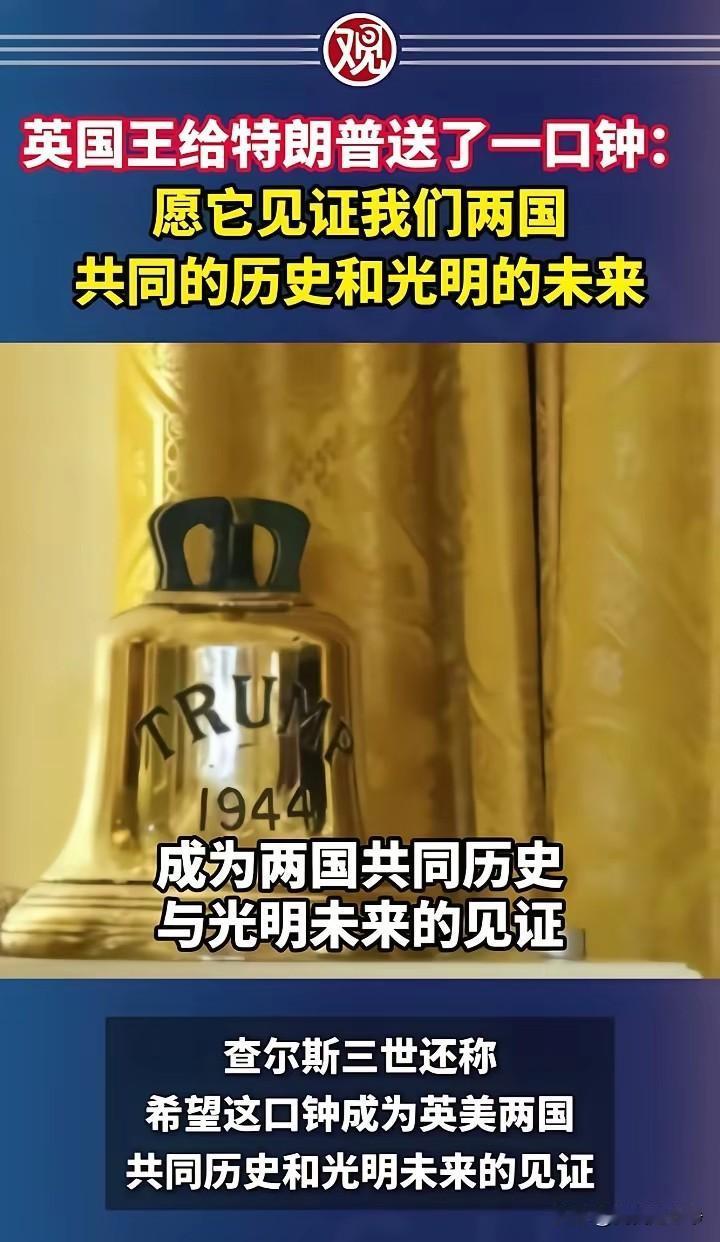 英国国王送给了特朗普一口钟,咱们很多的人都开始玩谐音梗了 认为英国人肯定是明白中国的风俗,送钟就是送终 实际上英国国王的本意不是这样的 英国海军历史上曾经有一艘潜艇就叫特朗普号 这艘潜艇是1944年退役,有可能这个钟是潜艇上的遗留物 大概率英国国王是提醒特朗普,你还是赶紧退役吧 赶紧给新人让位,不然的话,美国这250年的国运可就过不去了 反正肯定没安好心,就算不是送终的意思,也是让特朗普赶紧急流勇退的意思 老家伙就不要拦路了