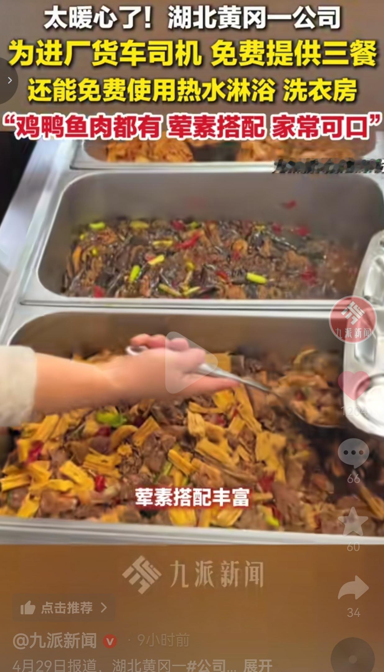 湖北黄冈这家工厂,把货车司机的“心酸路”,走成了暖心路 我真的被湖北黄冈这家工厂,狠狠整破防了! 跑长途的货车司机有多难,没亲身经历过的人根本不懂!为了赶时效不被扣运费,他们在高速服务区啃冷硬的包子、泡没营养的方便面,有时候赶装卸进度,直接窝在驾驶室里随便对付一口,周边连个能吃上热饭的饭馆都找不到,风餐露宿都是常态。 可就是这群最辛苦的底层劳动者,在黄冈这家工厂,感受到了实打实的温暖,被人放在了心尖上。 事情说起来特别暖心:工厂里的肖先生,每天看着进厂送货、装货的货车司机们,忙到没时间吃饭,只能蹲在车厢边、坐在驾驶座上啃干粮,心里说不出的难受。 他太清楚司机们跑长途的煎熬,吃不上一口热饭、洗不上一个热水澡、脏衣服攒一路没地方换洗,这些在旁人眼里微不足道的小事,却是司机们一路上最熬人、最无奈的坎儿。 看着师傅们满脸疲惫的样子,他当即跟公司商量,直接开会定下了一条暖心规矩:只要是进厂的货车司机,工作人员主动引导去食堂,一日三餐全免费! 别以为这免费的饭菜是应付事儿,这家工厂半点不糊弄!食堂的厨师还是股东的母亲,做的全是地道的家常口味,每天鸡鸭鱼肉换着花样来,荤素搭配得当,菜色天天不重样,热热乎乎的饭菜,吃起来比自己家里做的还踏实暖心。 新鲜的油豆腐炒青菜、入味的香辣土豆片,炖菜里的肉块给得特别足,没有虚头巴脑的花样,全是能吃饱吃好的实在菜。 有司机师傅打饭的时候,记者随口问了句饭菜好不好吃,师傅头都没抬,一边盛饭一边脱口而出“好吃”,那份藏不住的满足与踏实,隔着屏幕都能狠狠共情。 更让人动容的是,这份善意没有任何门槛,不光是往来的货车司机,就连来厂里打短工的务工人员,也能一样免费吃饭,不区别对待、不搞特殊,真心实意对每一个辛苦打拼的人好。 除了管够热饭热菜,工厂还特意为司机师傅们置办了24小时热水淋浴间和洗衣房。 大家想想看,司机们跑长途一路奔波,一身尘土一身汗,浑身疲惫不堪,能痛痛快快洗个热水澡,把脏衣服洗干净换上干爽的衣裳,这份舒坦,是多少钱都买不来的。 一开始很多司机师傅还觉得不好意思,怕给工厂添麻烦,总是推脱不去,可工厂工作人员格外热情,主动上前招呼,拉着师傅们就往食堂、淋浴间走,这份不客套、不敷衍的真心,谁能不感动? 网友看到后评论说:“就冲这波操作,以后拉货我就认准这家厂!货车司机在外跑运输,不求别的,能遇上这么暖心的地方,比啥都强!” 也有的网友说:“老板是真的懂人心、有格局!看透了司机师傅们在外遭的罪,不仅看在眼里,还实实在在放在心上帮着解决,活该他家生意越做越红火!” 还有的网友说:“我爸就是跑货车的,每次他出长途,我在家都提心吊胆,就怕他吃不好、睡不好。要是全国多几家这样的良心工厂,我们做家属的,也能少操无数的心!” 更有网友表示: “这才是做生意的正道,和气生财不是说说而已!你真心实意对司机师傅好,师傅们自然愿意来送货,口碑好了,生意怎么可能差?” 说句掏心窝子的话,市面上太多企业,眼里只盯着订单、盯着利润,把货车司机当成单纯的运输工具,从来不在意他们的辛苦与难处,装卸货刁难、连口热水都不给的情况比比皆是。 可这家黄冈的工厂,偏偏反其道而行之,他们没把司机当外人,而是当成了一起打拼的伙伴,看得见他们的奔波劳累,更用实际行动给足了温暖与尊重。 货车司机们风里来雨里去,翻山越岭、昼夜兼程,挣的每一分钱都是拿辛苦换来的血汗钱。 他们从来没有奢求过特殊照顾,不过是想要一口热饭、一个热水澡,一份最基本的尊重,就能觉得一路的辛苦都值得。 可就是这么简单的心愿,太多地方都没法满足,甚至连一句暖心的问候都没有,对比之下,这家工厂的做法,才更显得难能可贵。 这家工厂做的事,看似都是小事,却把“尊重”两个字,完完全全落到了实处。 他们心里明白,货车司机不是无关紧要的过客,而是撑起工厂运输链、一起共赢的重要伙伴,善待每一位劳动者,就是善待自己的生意。 这种不玩套路、真心换真心的相处,远比任何商业广告都有说服力,也更能走得长久。 我始终觉得,一个企业有没有温度,从来不是看它规模有多大、赚了多少钱,而是看它对待底层劳动者的态度。 黄冈这家工厂,没有什么惊天动地的壮举,只用一顿顿热饭、一个个热水澡,给奔波在外的货车司机,撑起了一个临时却温暖的避风港,也给所有企业,做了最棒的榜样。 对此,你怎么看? 信息来源:九派新闻