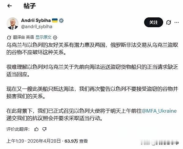 好端端的以色列和乌克兰突然吵起来了,起因居然是因为俄罗斯的粮食 乌克兰当地时间28号,乌克兰外长突然在社交媒体上发了一个帖子 控诉以色列购买了俄罗斯盗窃乌克兰的粮食 并且表示这种交易是完全的非法交易,破坏了以色列和乌克兰两国之间的友谊 很快以色列外长就对乌方的言论作出了回应,也是在社交媒体上回怼 以色列外长萨尔表示,以色列是一个法治的国家,乌克兰的指控没有任何的道理 其实购买俄罗斯粮食这个事情,本来就不是什么秘密 以色列这个国家对外吹嘘自己的农业很发达,但是掩盖不了国土狭窄的现实 以色列国家有80%的小麦进口需要俄罗斯和二毛来提供 而俄军占领土地上的农业生产一直在持续 乌克兰认为这个地方的小麦是他们的,任何人都不应该买 谁买谁就是违法 但是以色列人不这么认为,他们觉得我这是正常的商业行为 你说这小麦是你的就是你的吗? 你叫他一声,他会答应吗? 人家俄罗斯的商人,一半是俄罗斯的小麦,一半是乌克兰的小麦掺在一起卖 难道别人还不能买了吗? 大家看看吧,双方的三观根本就不在一个频道 以色列那是一国的商人,谁的价钱最合适,谁的质量好,人家就买谁的 乌克兰道德绑架那一套用在欧洲人身上挺好用 但是还想绑架以色列吗? 人家鱿鱼才是道德绑架的祖宗,二毛你还嫩得很啊