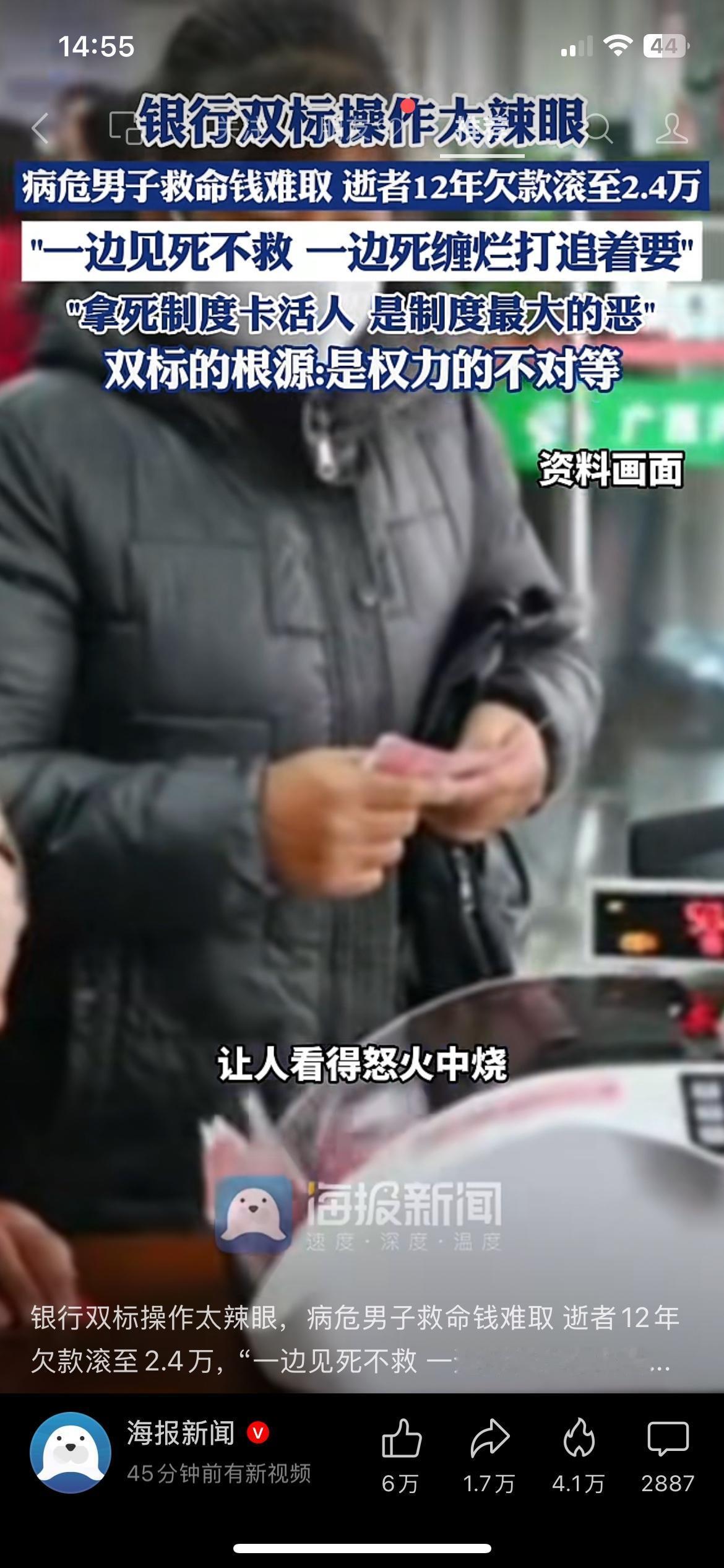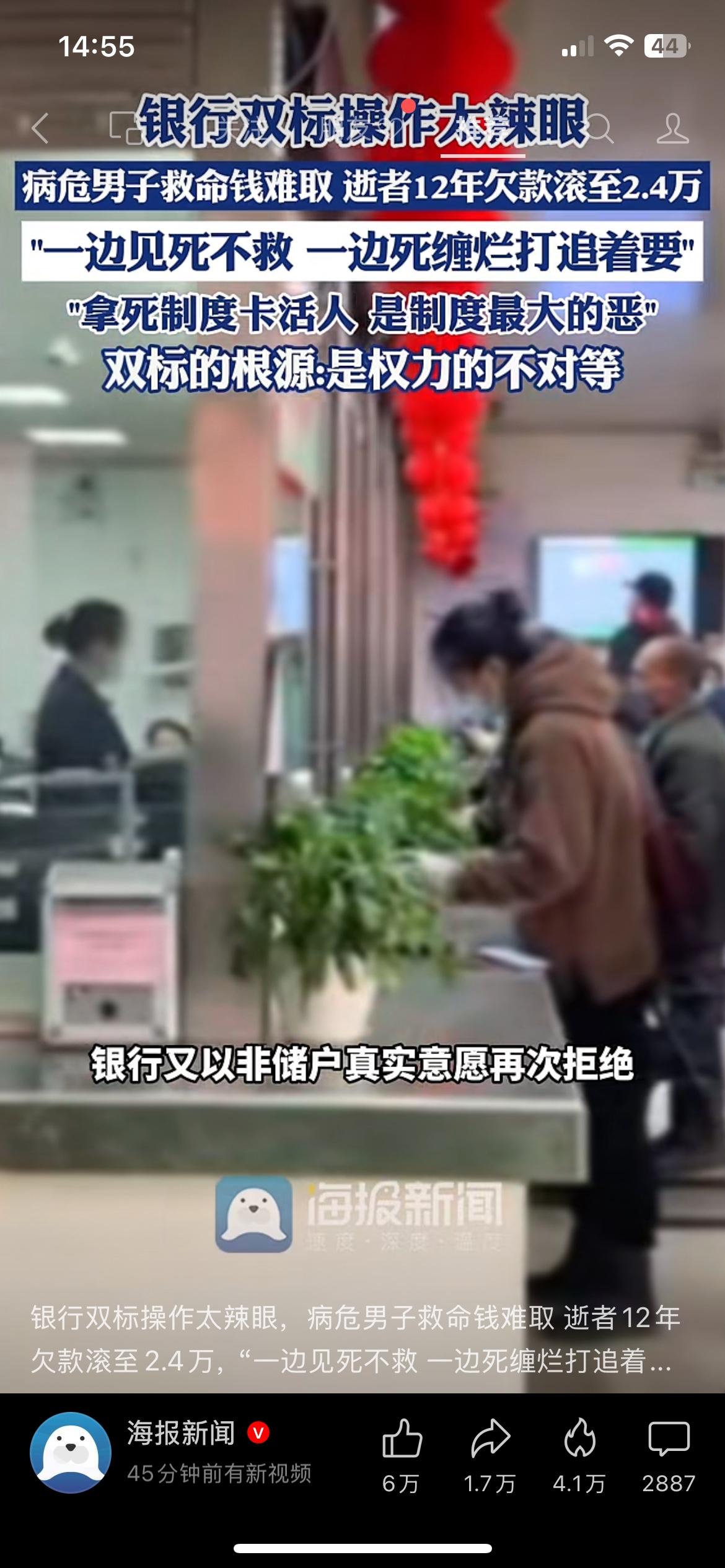 一边卡死救命钱,一边追讨陈年旧账,银行双重标准引全网热议 近期两件民生小事放在一起对比,看完让人心里很不是滋味。 重病老人急需用钱救命,手续层层受限,取钱处处被刁难。 反观搁置十几年的陈年欠款,时隔多年依旧持续追缴叠加利息。 死板的流程条例,该变通的时候不懂变通,少了很多人情温度。 金融服务的根本,终究是服务民生,体谅特殊群体的难处。 规矩需要遵守,但不该用冰冷制度,为难普通人的难处。 你在生活里,遇到过流程死板、不懂变通的办事经历吗? 银行服务 民生热点 社会观察银行拖延推诿