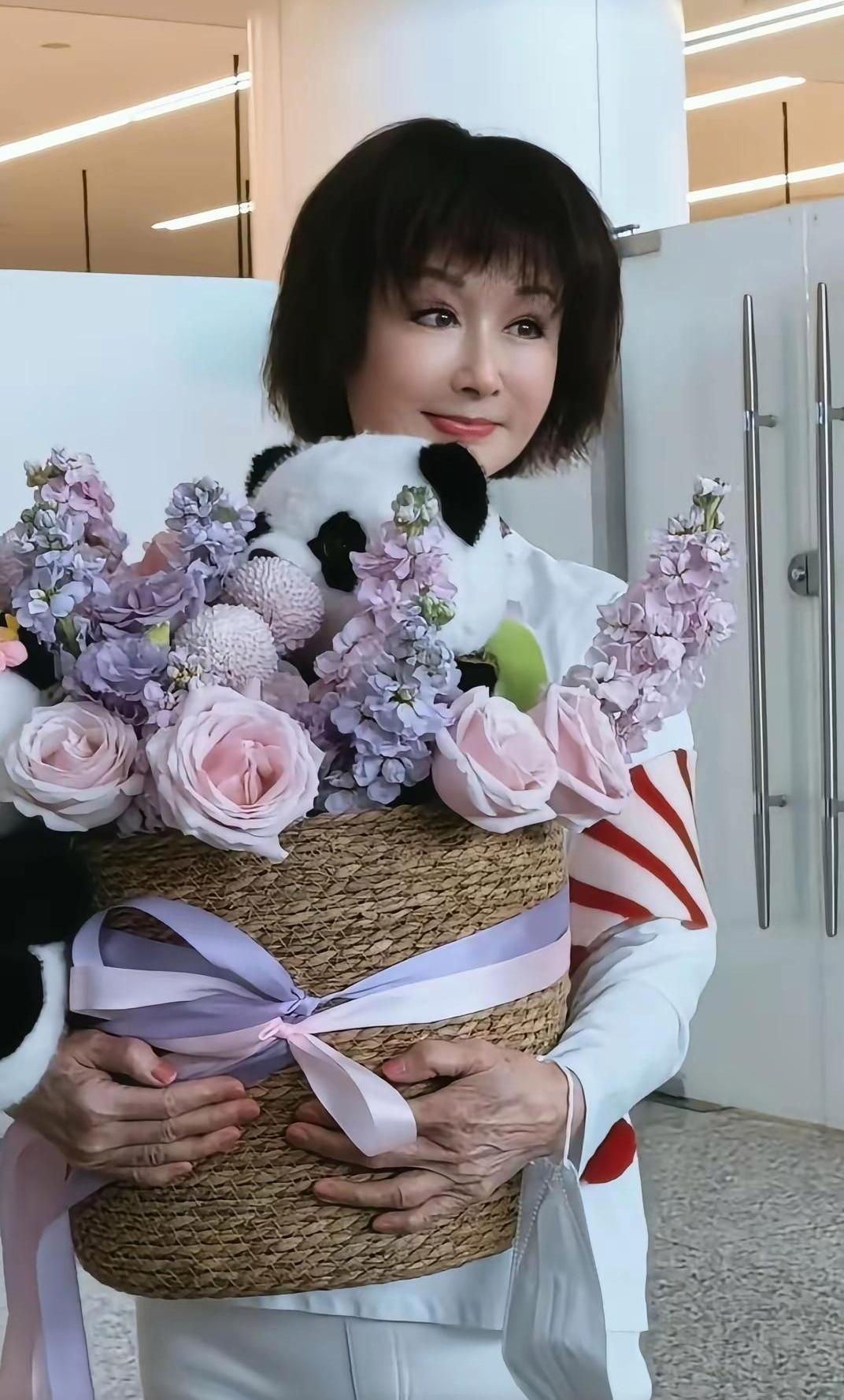 乍一看,抱着花篮的潘迎紫体态优美,身材较好,双腮染赤,眸似秋水,玉颜如春哈;细一瞧,面部过度饱满肿胀,表情僵硬,缺乏清晰的轮廓,很明显的枕头脸;再看涂了蔻丹的那双手,手背上的青筋如蚯蚓般弯曲,分分钟凸显了其历经的沧桑岁月,这种18岁的脸、80岁的手带来的反差感也忒大了吧!其实,真正的美人,从来不是拼命地留住皮囊,而是坦然地雕刻自己的灵魂哈,你觉得是这样吗?