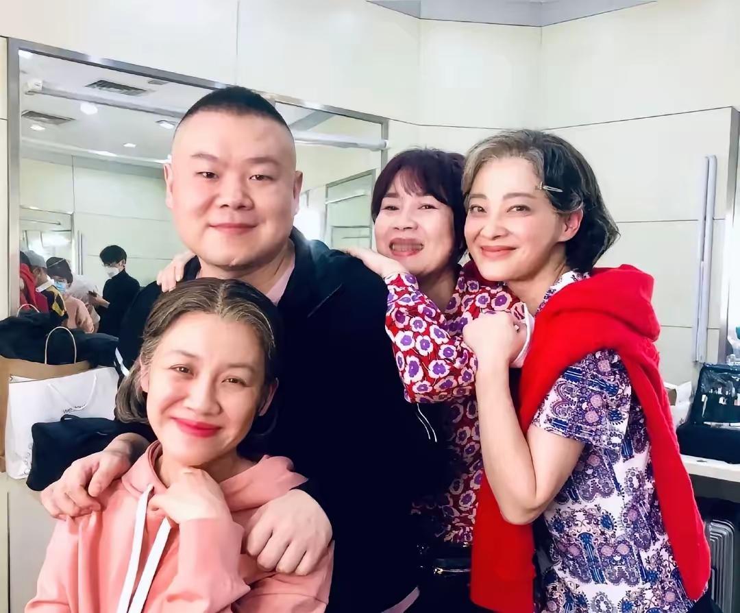 这张照片是电视剧《父母爱情》剧组成员与相声演员岳云鹏的后台合照: 镜头中的刘琳柳眉杏眼,檀口樱唇,笑意粲然,白发丝丝缕缕,可依旧清雅飞逸;穿着花衫披着红外套的梅婷螓首蛾眉,珠辉玉丽,巧笑倩兮,气质闪闪发光!略显发福的岳云鹏朗目疏眉,唇若涂朱,英气勃发哈!趴在小岳岳肩头、笑若暖阳的女星是谁?