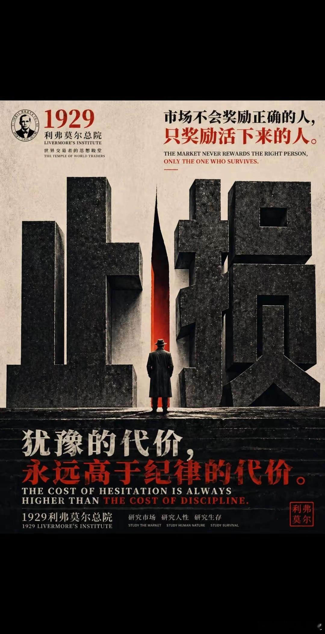 第四层(铁律)1.不止损,本质是拒绝认错。2.越犹豫,亏损成本越高。3.能砍掉亏损,才有资格拿未来。4.市场不会等你想明白。———很多老交易员,会抽一张利弗莫尔纪律扑克牌,提醒自己一句话:“该结束的,不要拖。”活下来,比赢一次更重要。——1929利弗莫尔总院出品1929利弗莫尔总院 利弗莫尔
