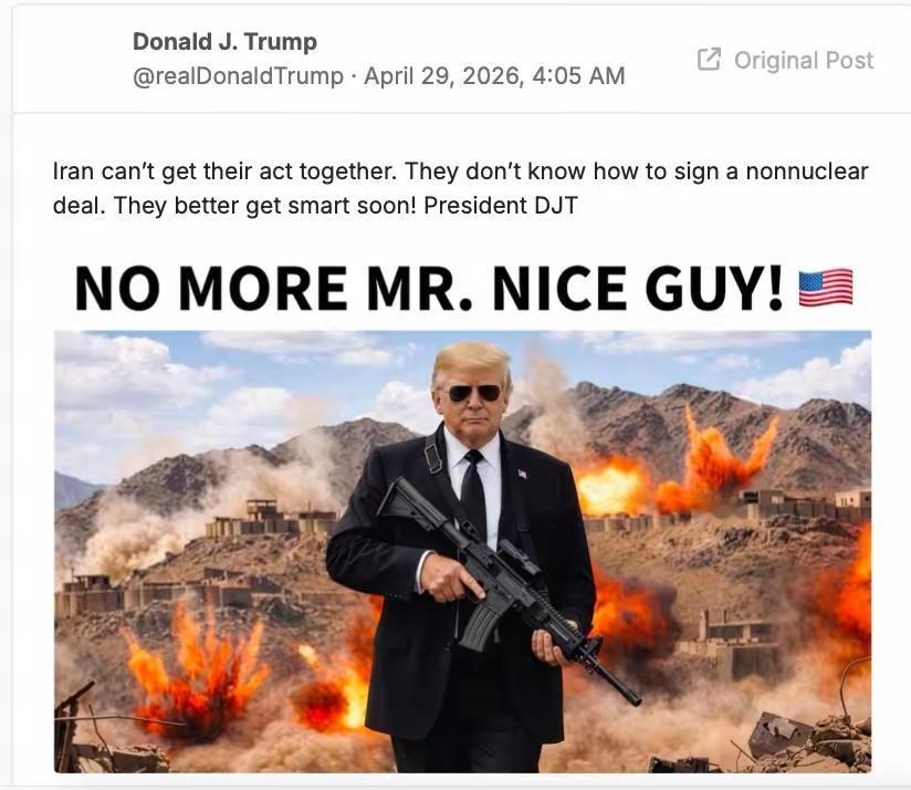凌晨突发!特朗普深夜亮剑,高调放话,威胁伊朗 太炸裂了!美东时间凌晨四点多,别人还在熟睡,特朗普直接空降社交平台,上线发飙。只见他甩出一则重磅动态,火药味直接拉满。 这次,他不光动口,还配上AI合成狠图,画面气场十足,自身霸气出镜,持枪姿态锋芒毕露,配图上方更是直言:不会再做好好先生了。 文字里更是毫不留情痛批伊朗,直言伊朗内部人心不齐、步调混乱,压根不懂怎么签订非核协议,还霸气警告伊朗趁早醒悟、识清时务,别再硬扛到底。 很明显,特朗普这是彻底撕下温和伪装,不再刻意收敛锋芒。一张狠图、几句硬气喊话,赤裸裸向伊朗亮出底牌、强势施压。 中东局势瞬间被点燃,这番高调威慑,无疑给美伊博弈再添烈火,后续局势怕是要越来越紧张。 特朗普雷人言论 特朗普状态 特朗普发难 特朗普外交突袭