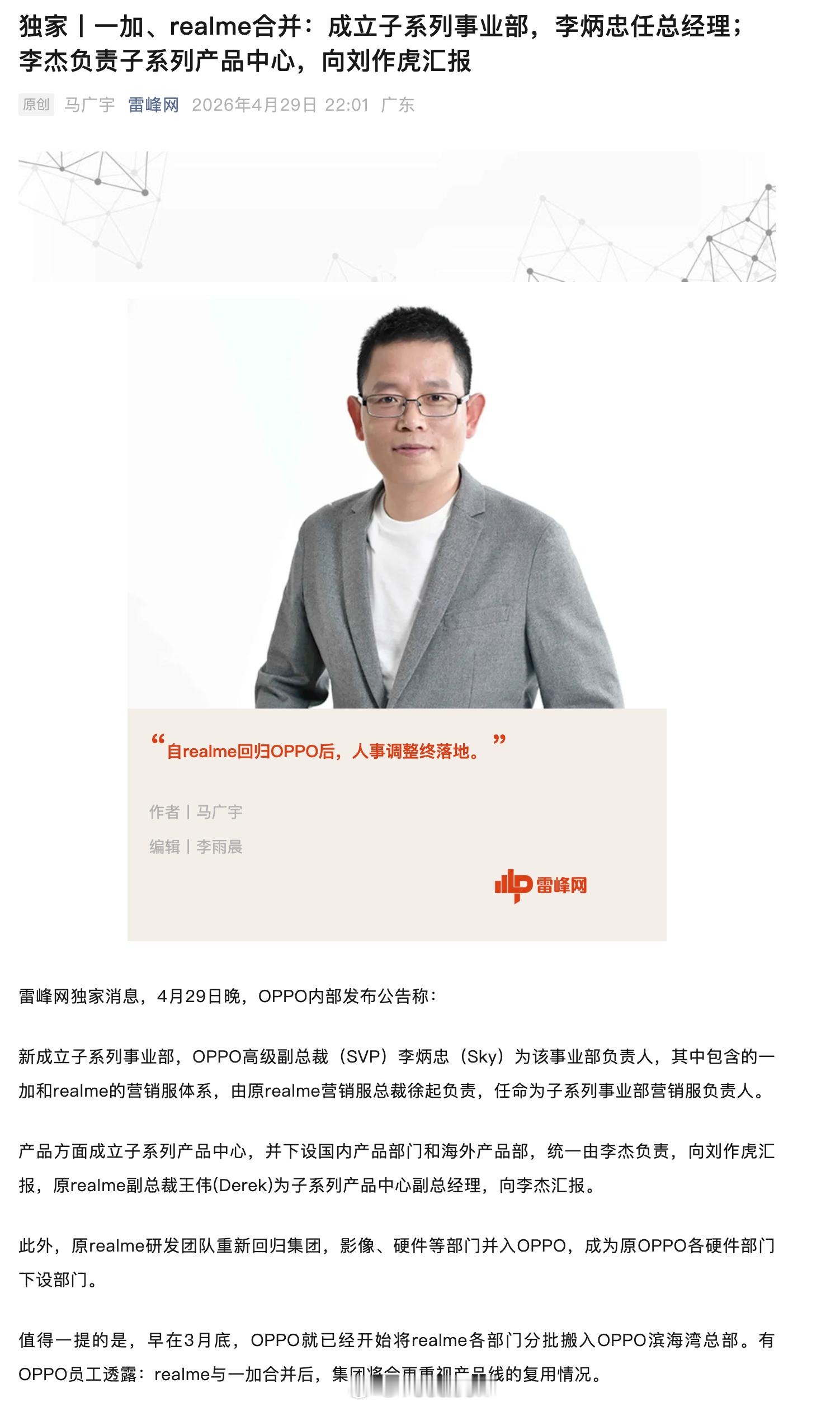 与此同时,原 realme 研发团队重新回归集团,影像、硬件等部门并入 OPPO,成为原 OPPO 各硬件部门下设部门。