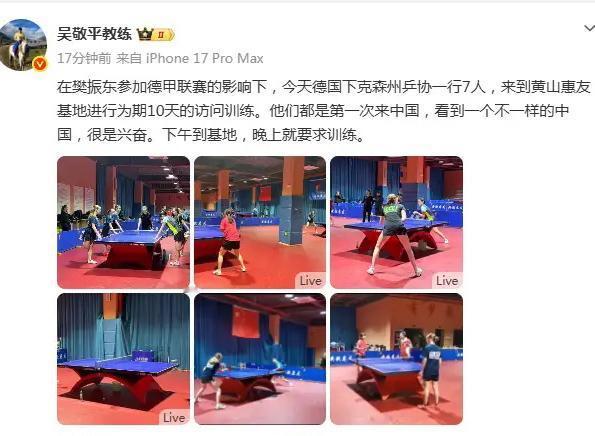 吴敬平教练发文谈樊振东参加德甲的影响: 在樊振东加盟德甲联赛的影响下, 德乒协派代表到黄山惠友乒乓球训练基地访问交流训练! 乒乓球外交功不可没, 体育无国界, 两国关系的友好往来, 小球推动大球, 打开两国之间的大门, 今天中德关系发展融洽, 乒乓球外交硕果累累, 让世界更加了解我们祖国, 提升了中华文化的影响力! 向功勋教练吴敬平, 李富荣,蔡振华致敬! 樊振东加盟德甲的意义重大, 也是中德文化体育交流活动的 桥梁,意义非凡!