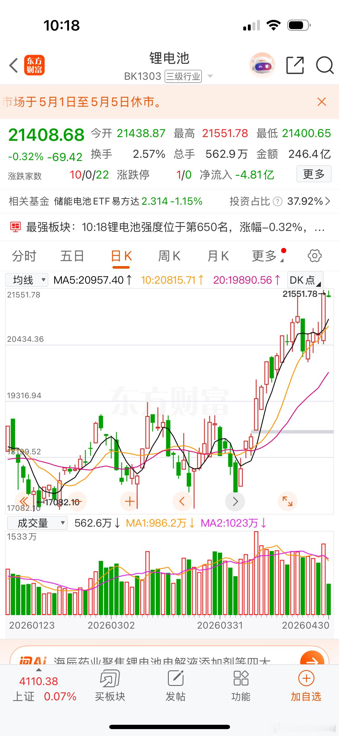 锂电池高景气度,现在是电动车和储能需求旺盛,带动产业链高景气,据说一季度储能锂电池出货量达215GWh,同比高增139%,产销两旺,据说头部企业订单已排产至明年第二季度。短期锂电反弹不跌破5日均线还可以持股,操作上,这里短期还可以继续持股待涨,节后有回踩再低吸。