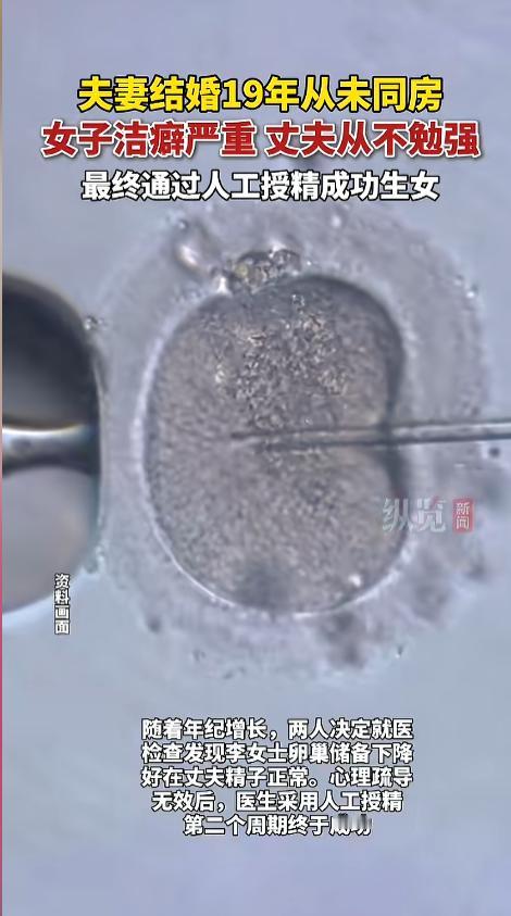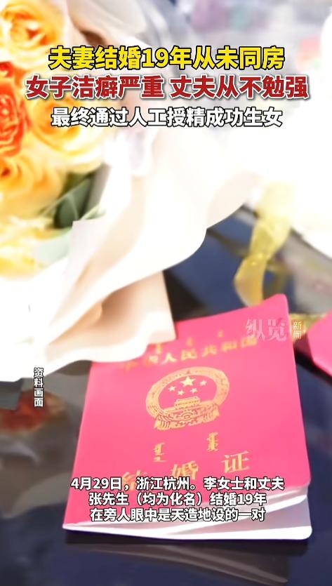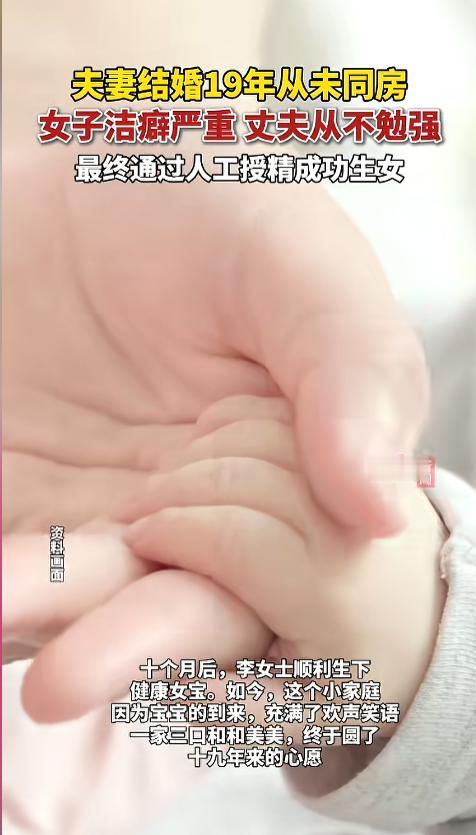 “绝对是真爱!”4月29日报道,浙江杭州,一对夫妻结婚19年,却因为妻子重度洁癖,双方从没同过房,丈夫也表示了理解。随着年纪增长,他们有了要孩子的想法,最后选择了人工受精,成功生下了一个女儿!网友:这19年到底咋过的啊! 据媒体报道,这对夫妻结婚19年了,在别人眼里,简直是天造地设的一对,让人十分羡慕。可光鲜背后,却有着难言之隐,两个人一直没能有个孩子。 这问题出在妻子身上,但并不是生育功能的事儿。原来,妻子患有严重的洁癖,对身体接触极度的抗拒和恐惧。丈夫也比较开明,充分尊重了妻子的意愿,一直也没有强求。 可随着年纪越来越大,两个人一直没有孩子,也开始着急起来,为此,他们专门去了医院。刚开始,医生的方案是心理疏导,也就是让妻子不再那么抗拒,两个人自然生育。可没想到,这套方案失败了,妻子那里过不去心理的这道坎。 后来,医院就只能采用了第二套方案,那就是人工授精。但两个人年纪也不小了,妻子的卵巢储备也下降了。但好在丈夫的精子质量还不错,第二次就成功受孕了。 经过十月怀胎,妻子成功生下了一名女婴,两个人也算是圆了这19年的梦! 网友看后表示,十九年啊,太不可思议了!这得有多爱,才能一直陪着,一直忍受!真是开了眼了! 信息来源:《夫妻结婚19年从未同房,女子洁癖严重,丈夫从不勉强。最终通过人工授精成功生女。》纵览新闻