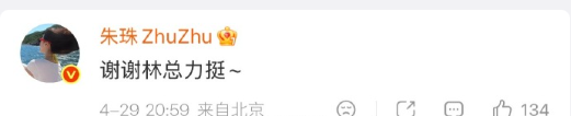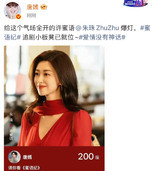 4月29日,唐嫣 发文:“给这个气场全开的许蜜语朱珠爆灯,《蜜语纪》追剧小板凳已就位~”随后,朱珠回复:“谢谢林总力挺~”