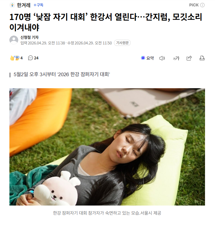 首尔市29日表示,将于5月2日下午3点在汝矣岛汉江公园多功能广场举办"2026汉江睡觉大赛"。该比赛始于2024年,是一场市民聚集在一起进行熟睡竞赛的别具特色的大赛。将根据参赛者的睡眠测量记录,综合评估△深度睡眠维持时间 △睡眠质量评分,最终决定排名。这不仅仅是简单的午睡,而是在各种外部刺激下仍能保持深度睡眠状态的"睡眠专注力"将成为评判标准。