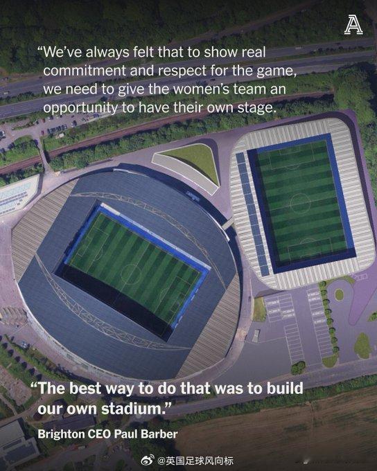 【球场也要男女搭配】布莱顿老板托尼-布罗姆,已经同意出资兴建全欧洲首个女足比赛专用足球场。这个新球场,就建在俱乐部主场法尔默球场旁边,容量为1万人,耗资7500-8000万英镑,预计2030年建成并投入使用。英超联赛