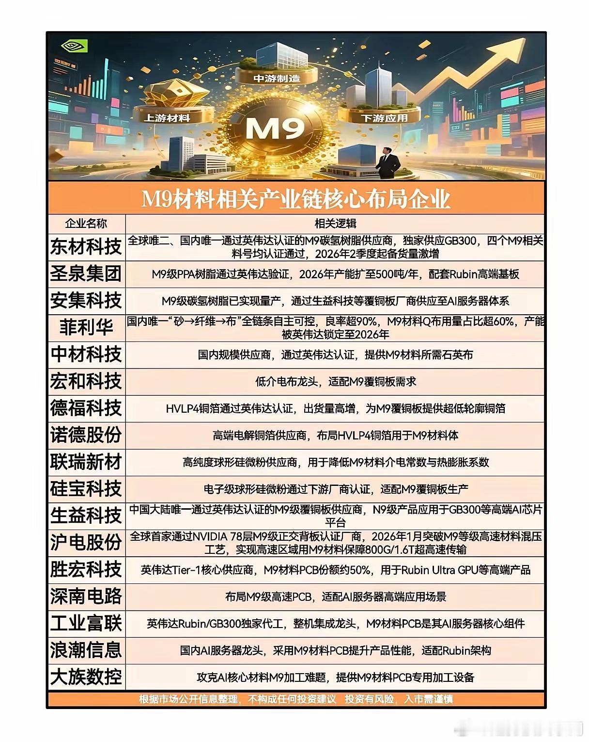原创精简英伟达GB300、Rubin架构带动AI算力升级,M9材料作为高速PCB/覆铜板刚需基材,凭借超低介电损耗特性,成为支撑800G/1.6T高带宽传输的核心壁垒赛道,英伟达认证构筑极高行业门槛,产业链卡位战全面打响。✅核心龙头(已获英伟达认证)东材科技:国内唯一、全球唯二M9碳氢树脂认证企业,独家供货GB300;生益科技:大陆唯一M9级覆铜板认证厂商,绑定英伟达高端平台;沪电股份:全球首家78层M9正交背板认证厂商,突破高速混压工艺;胜宏科技:Rubin架构M9背板核心供应商,订单份额领先。✅国产全产业链闭环上游菲利华、中材科技供应M9石英布,德福科技、铜冠铜箔提供超低轮廓铜箔,联瑞新材配套硅微粉;中游圣泉集团突破PPO树脂,下游深南电路、工业富联承接PCB与服务器制造,全环节完成国产替代卡位。当前M9订单已被英伟达锁定、产能持续紧缺,是AI算力自主可控的硬刚需;短期板块情绪偏高,但长期国产替代+巨头锁单逻辑扎实,核心认证龙头具备稀缺性。个人观点,不构成投资建议,股市有风险。