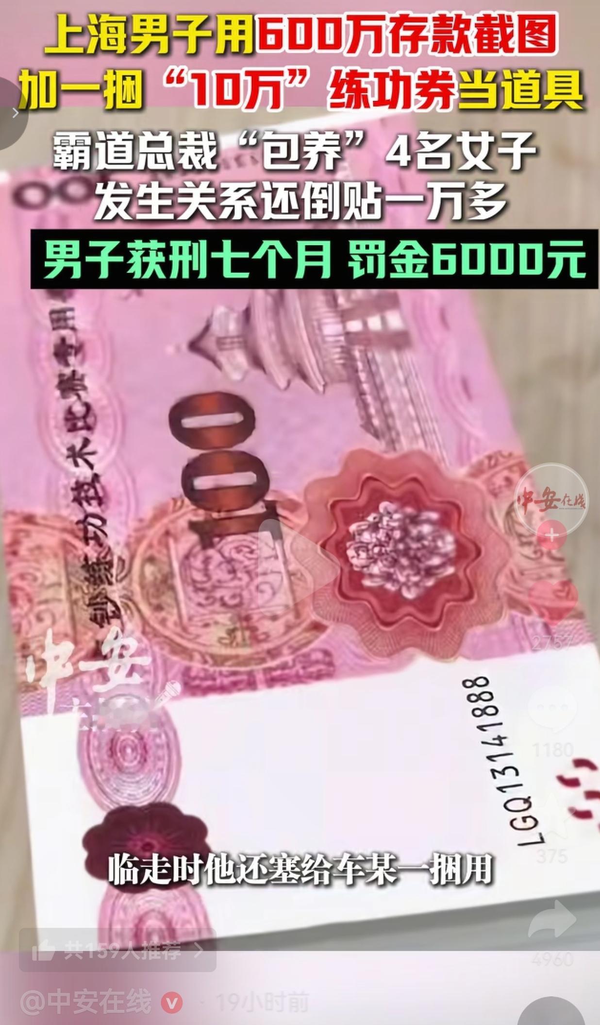 一捆练功券骗了4个姑娘,说好的3万“包养费”,最后反而倒贴一万多 谁能想到,一捆成本不到20块的练功券,配上一张P出来的600万存款截图,竟让四个年轻姑娘栽了大跟头,不光被骗了感情,还白白倒贴钱财,看完实在又气又揪心。 这事发生在上海,涉事男子杨某本身就是个无业游民。他整天泡在短视频平台,专门盯上日常分享生活、心思单纯的年轻女孩伺机下手。 他搭讪套路十分熟练,一上来就夸赞对方长相漂亮,谎称自己是做房地产生意的大老板,张口就给人画大饼:每月给3万,愿意长期照顾对方一辈子。 为了增加可信度,他先发伪造的600万存款截图,又晒出虚假名牌包订单,把自己包装成出手阔绰的有钱人,专门拿捏一心想走捷径的姑娘。 第一个上当的是车姑娘,看到所谓存款和消费截图后,她彻底放下戒备,误以为真遇到了靠谱富豪。 两人线下见面结束时,杨某拿出一捆用胶带缠得严严实实的10万现金,当作见面保障金,还特意叮嘱她不要拆开,等第二天再来取回。姑娘毫无防备,自始至终都没有拆开查验。 可见面过后,杨某立马换了态度,借口手头急需用钱、转账延迟,让车姑娘先帮忙垫付2300元。 被富豪人设冲昏头脑的她,没有多想就转了账。 结果到了第二天,承诺的转账迟迟不到账,杨某也直接失联跑路。她心里发慌,赶紧拆开那捆所谓的现金,才发现里面全是银行练功券,没有一张真币。 从2025年2月到4月,杨某靠着这套画大饼、晒假资产、用练功券冒充现金、再借钱跑路的固定套路,接连欺骗了四名女孩。 其他几位受害者和车姑娘经历如出一辙,被高额承诺和假现金蒙蔽双眼,不仅付出了感情,前后还被对方骗取一万多元。 事发后女孩们选择报警,真相才彻底曝光。 杨某根本不是什么生意老板,只是游手好闲的专业骗子。最终他因诈骗行为被依法判刑罚款,被骗钱款也被追回,也算是给几位受害者一个公道。 网友看到后评论说:“真的离谱!每月3万包养?真富豪哪有空网上到处私信陌生人?明显是陷阱,怎么就有人看不穿呢?” 也有的网友说:“最气人的是:骗子一分钱没花,白骗感情还骗钱;姑娘真心错付,还倒贴,太不值了!” 还有的网友说:“P图造假、练功券充现金,这套路粗制滥造,可偏偏就有人上当,说到底还是被‘躺赢梦’冲昏了头。” 更有网友表示:“不是说姑娘该骂,只是想提醒:天上不会掉馅饼,所谓‘豪门捷径’,全是骗子画的大饼!” 说句实在的,看完整件事,我既气愤骗子的无耻套路,又心疼姑娘太过天真单纯。 她们本身不坏,也并不愚笨,只是被不用辛苦上班、每月轻松拿三万的好日子美梦冲昏了头脑。 谁都向往安稳轻松的生活,但偏偏很多人忘了,天底下从来没有免费的午餐,更没有凭空降临的豪门眷顾。 骗子的套路其实一点都不高明,甚至廉价又粗糙。一张修图造假的截图、一捆几十块的练功券、几句花言巧语,就能轻易让人迷失判断。 之所以屡屡得手,无非是精准抓住了人性的弱点:总想走捷径、图轻松安逸、幻想不劳而获。 连对方真实身份、人品底细都一概不知,就轻易相信陌生人大手笔的承诺,还私下见面、随意转账。 这不是简单的天真,而是把自己的真心和安全感,全都赌在了陌生人的良心上,从一开始就注定吃亏。 更让人唏嘘的是,骗子自始至终没投入一分成本,反倒靠着虚假套路牟利;而受害的姑娘,不仅赔了感情、损失了钱财,还挫伤了自尊心和对他人的信任感,付出的代价实在太大。 这件事最扎心的地方,从来不是骗子手段有多高明,而是现实里太多人总想走捷径,以为依附他人就能改写自己的人生。 可现实总会狠狠打脸:真正安稳体面的好日子,从来不是靠别人的承诺施舍而来,更不是靠空想等来的。网上那些动辄每月几万的优厚许诺,看似诱人,实则都是裹着糖衣的陷阱。 靠别人施舍撑起来的美梦,风一吹就破碎;靠自己双手打拼换来的生活,才足够踏实、足够硬气,谁也夺不走。 真心提醒所有年轻姑娘:别用自己的真心和尊严,去赌陌生人随口画的大饼。你若踏实努力,自有安稳前程;凡事靠自己,才是一生最大的底气。 对此,你怎么看? 信息来源:中安在线