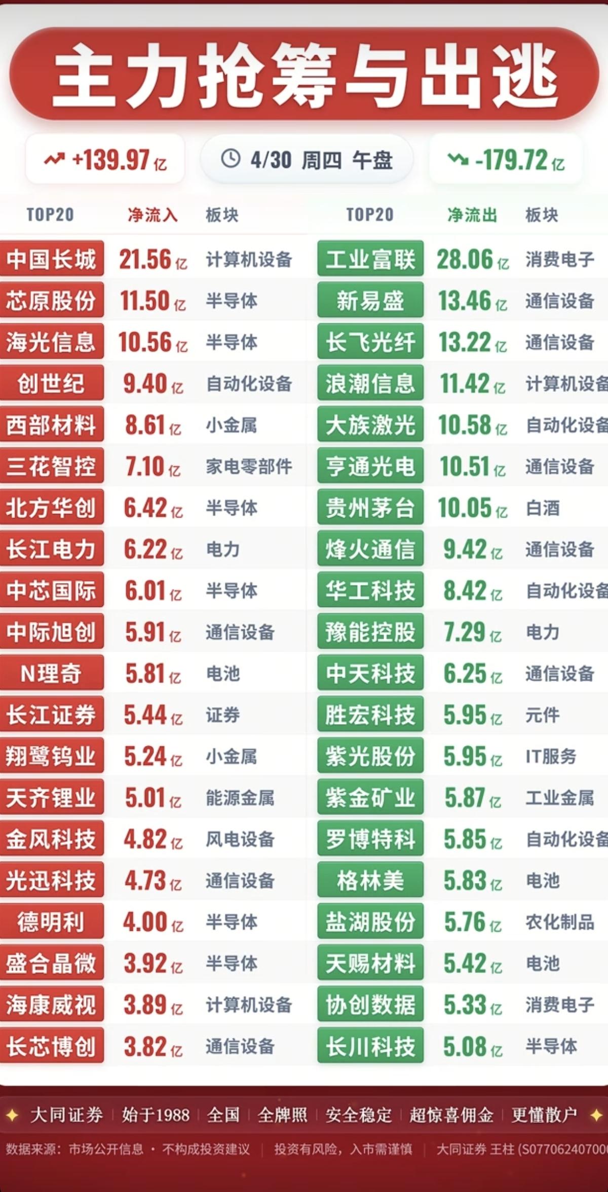 4.30周四 主力大资金 资金抢筹出逃监测 资金抢筹: 能源金属碳酸锂、机器人、航天装备、航空装备、半导体芯片、房地产开发等资金流入。 资金出逃: 玻璃玻纤、酒店餐饮、电力电网、公用事业、电池相关等资金出逃