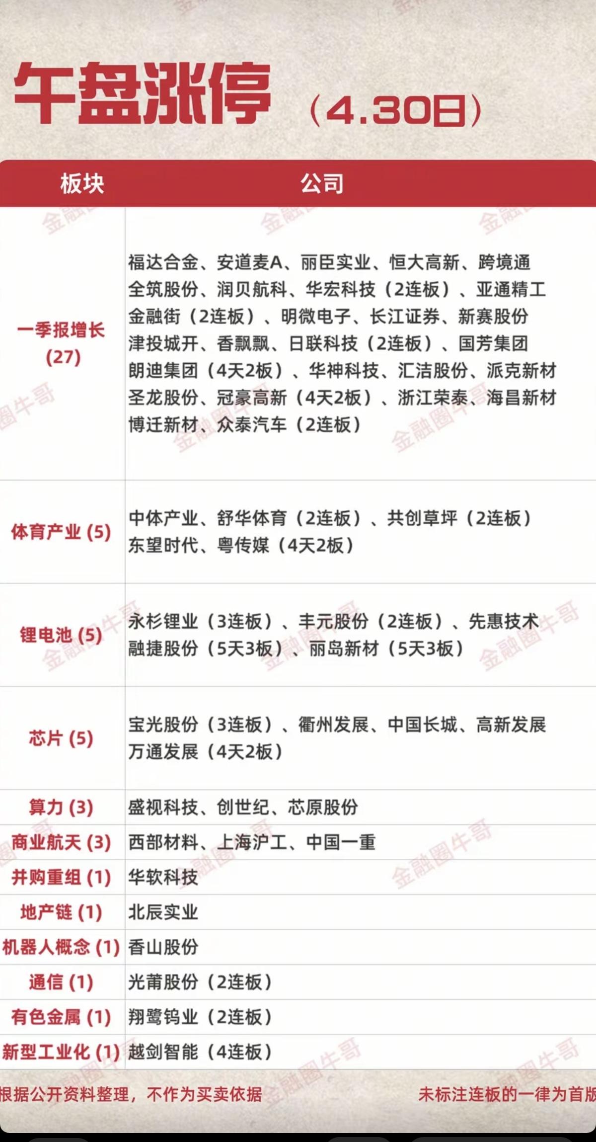 4.30周四 涨停板股票:题材+明细表! 1.一季报增长 27股涨停 2.体育产业 5股涨停 3.锂电池 5股涨停 4.芯片半导体5股涨停 5.算力租赁 3股涨停