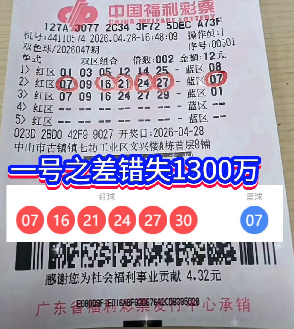 一号之差,与千万巨奖擦肩!中山彩友的遗憾,尽在一念之间。 在双色球2026047期开奖中,广东中山一位彩友以自选单式、两倍投注的方式,选了三组号码。当期红球开出07、16、21、24、27、30,蓝球为07。 其中,彩友投注的第二注号码——红球07、09、16、21、24、27,蓝球07——因红球仅最后一个数字“30”之差,最终摘得“5+1”,收获两注三等奖。再加上第三注号码中的小奖,总计奖金6020元。而那一期一等奖单注奖金高达656万余元,若这一注全中,两倍投注便可揽获1300多万元! 一号之遥,咫尺天涯,自选之憾,更觉怅然。然而幸运的转身或许只为提醒:过程亦是一种风景,淡然回味,亦不失为购彩之余的余韵。