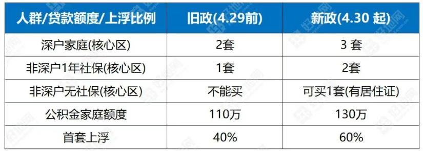【深圳再发布房地产救市新政!核心区最多可买3套】深圳市住房和建设局印发《关于进一步优化调整本市房地产相关政策的通知》。自2026年4月30日起正式施行。 1、优化住房限购政策 本次限购放宽分核心区与非核心区差异化执行,核心区限定为福田区、南山区、宝安区新安街道,实行“增购”政策,其中符合购房条件的本市户籍家庭最多可购买3套,连续缴纳社保或个税满1年的非本市户籍家庭最多可购买2套; 非核心区政策进一步放宽,持有有效深圳经济特区居住证的非本市户籍家庭,在核心区之外购买1套商品住房,无需提供社保或个税证明; 其他情况保持不变,无法提供社保或个税满1年证明的非本市户籍居民,在深圳其他区域购房政策不变,成年单身人士按居民家庭标准执行。 2、上调住房公积金贷款额度 基础额度大幅提升,个人申请住房公积金贷款的最高额度从60万元提高至70万元,家庭共同申请的最高额度从110万元提高至130万元; 同时优化额度上浮比例,首套房贷款额度上浮比例从40%提高至60%,新增多子女家庭支持政策,初婚初育家庭购买住房额度上浮50%,有两个及以上子女的家庭购买住房额度上浮70%(与首套房上浮比例不可叠加,需二选一),购买保障性住房的额度上浮比例从20%提高至40%。 3、最高贷款额度测算及政策实施 若同时符合多种上浮情形(如购买保障性住房且为首套房),额度可累加,最高可上浮170%;据此测算,个人最高可贷额度为189万元(70万元×170%),家庭最高可贷额度为351万元(130万元×170%)。