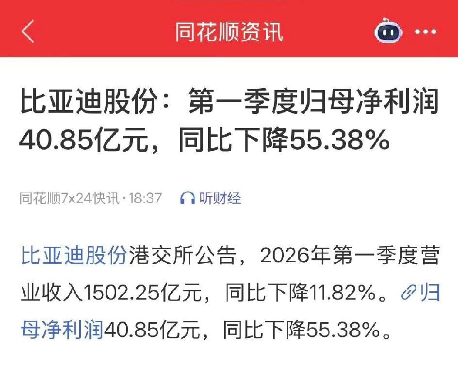 都说迪不拉,吉不食,然而一季报出炉了,吉利财务指标远超比亚迪: 比亚迪:Q1营收1502亿元(同比-11.82%), 归母净利润40.85亿元(同比-55.38%), 总销量70.05万辆(同比-30%)。 吉利汽车:Q1营收838亿元(同比+15%), 核心归母净利润45.6亿元(同比+31%), 总销量70.9万辆(同比+1%)。 虽说吉利营收只有比亚迪的一半多,但赚的钱比迪子还多!难道迪子真的“不行了”吗?其实,真相没那么简单。 比亚迪这40多亿的利润,看似惨淡,但最大的“元凶”其实是汇率。因为人民币升值,一季度产生了约21亿元的汇兑损失(去年同期可是有19亿收益的),这一来一回,账面利润直接少了近40个亿。所以迪子净利润大跌只是偶然因素,主营业务依然稳健。 此外,比亚迪一季度砸了113亿元搞研发,比它当季赚的净利润还多出72个亿!国内销量虽然跌了三成,但单车平均售价反而提升了,迪子正在主动放弃低端内卷,靠腾势、方程豹、仰望这些高端品牌,以及海外出口(一季度卖了近32万辆,占比高达46%)来拉升利润,所以迪子的毛利率高达18.8%,而吉利的毛利率17.5%,迪子更胜一筹 。 吉利的核心利润大增31%,靠的不是某个爆款车,而是整个品牌矩阵的全面开花。极氪、领克在高端市场站稳了脚跟,拉高了单车利润;银河和“中国星”系列稳住了基盘销量。一季度出口暴涨126%。吉利证明了自己不仅能打价格战,更能通过多品牌协同和全球化布局,在存量博弈中实现“量利齐升”。 一个季度的领先不是真正的领先,至于谁能笑到最后,还要持续观察,大家怎么看?