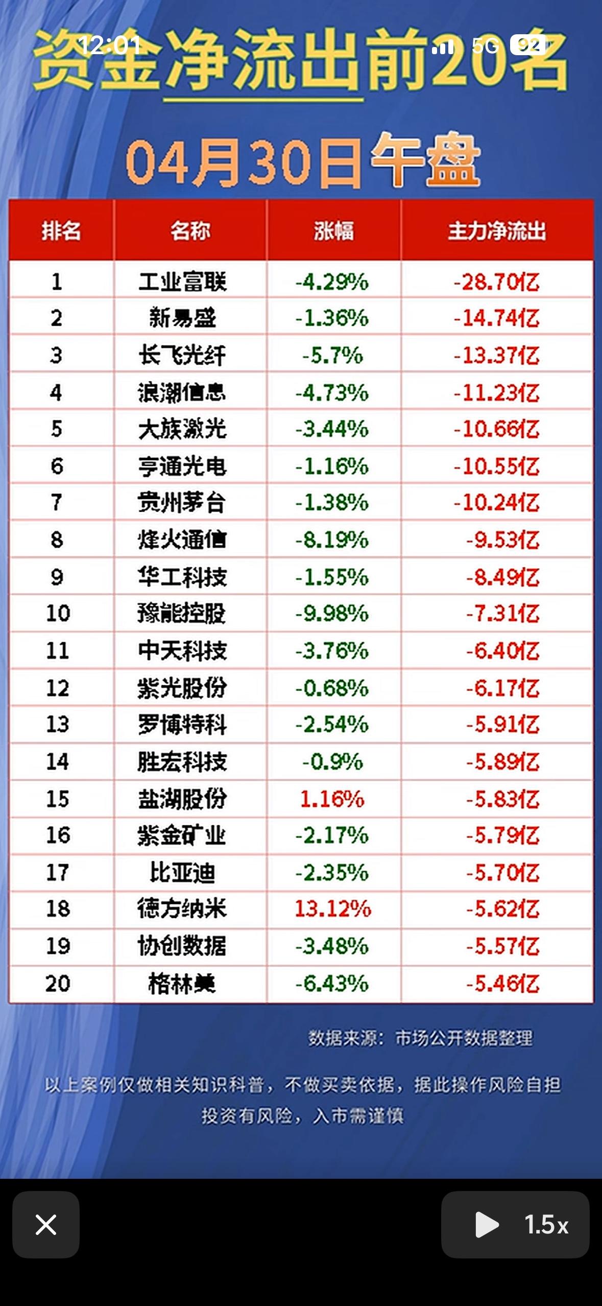 “4月30日股市风云变幻,前20名净流入与净流出大揭秘!”📈💰📊 4月30日的股市那叫一个风云变幻!这天两市资金净流出前20股备受关注。与此同时,昨晚国际油价再次暴涨,全球股市要进入震荡期了。 对于股民来说,可得多留意这些动态。没有几个主力资金会在利好一出来就把股价直线拉涨停,所以得有点耐心,说不定利好“飞”一会,投资机会就来了。就像培育钻石板块,因散热方案利好,工业金刚石价格有小幅上涨,不过目前相关业务还在起步阶段,对上市公司盈利贡献有限。4月30日这一天,股市里真是暗藏玄机,大家都得擦亮眼睛。