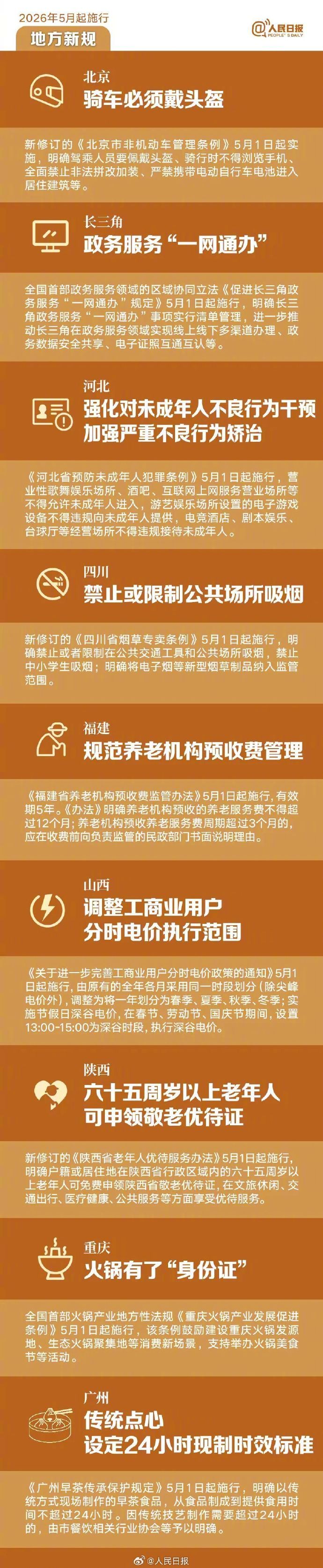 【与你有关!#5月起一批新规将施行#】①#5月起未经同意不得发送商业短信#;②#民用无人机需实名登记激活#;③北京:驾驶、乘坐电动自行车应当规范佩戴头盔;④四川:禁止或限制公共场所吸烟;⑤重庆:火锅有了“身份证”……更多,戳图了解↓↓↓(人民日报)